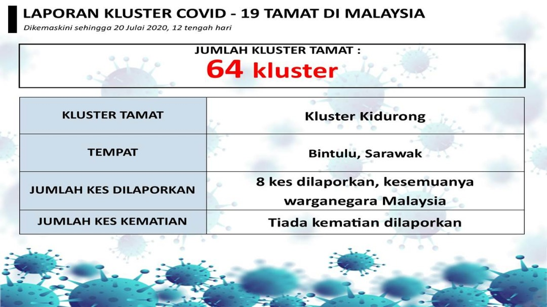 Laporan Kluster COVID-19 Tamat Di Malaysia 20/07/2020 1200 PM Asrul Siaran Media 20 July 2020 Hits: 665 Rating: ( 0 Rating ) Please Rate Vote 1 Vote 2 Vote 3 Vote 4 Vote 5 Facebook Twitter Prev Next