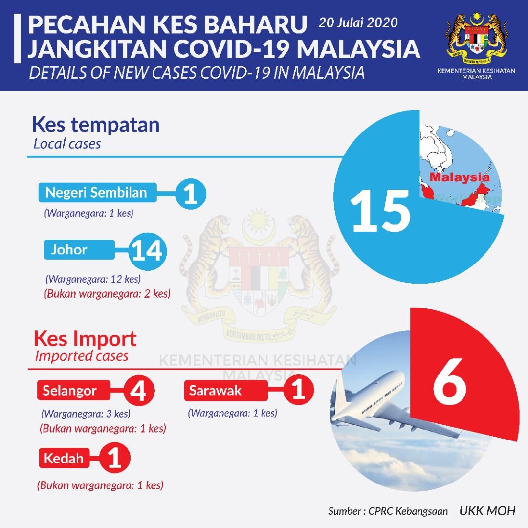 Statistik Pecahan Kes Baharu Jangkitan COVID-19 Malaysia 20/07/2020 Asrul Siaran Media 20 July 2020 Hits: 706 Rating: ( 0 Rating ) Please Rate Vote 1 Vote 2 Vote 3 Vote 4 Vote 5 Facebook Twitter Prev Next