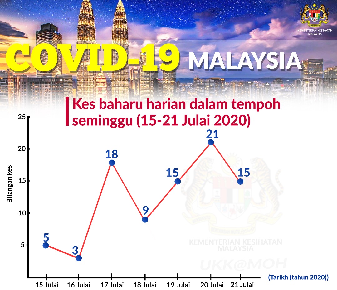 COVID-19 Malaysia - Kes Baharu Harian Dalam Tempoh Seminggu (15-21 Julai 2020) Asrul Siaran Media 21 July 2020 Hits: 987 Rating: ( 1 Rating ) User Rating: 5 / 5 Please Rate Vote 1 Vote 2 Vote 3 Vote 4 Vote 5 Facebook Twitter Prev Next