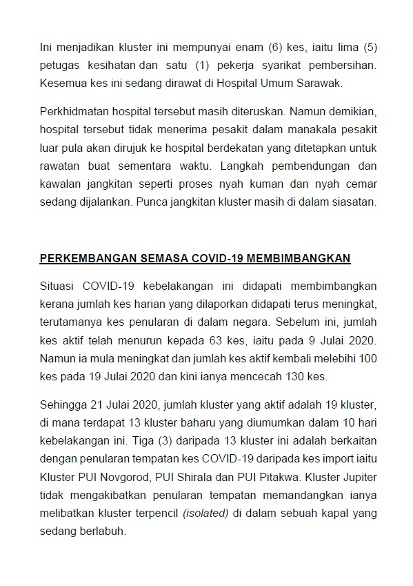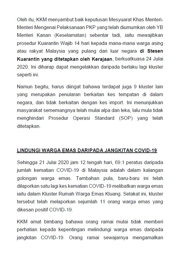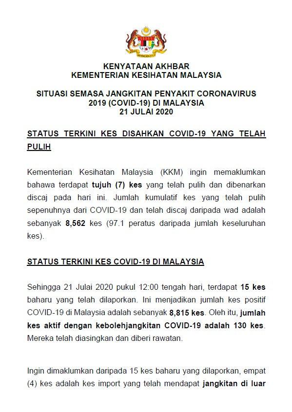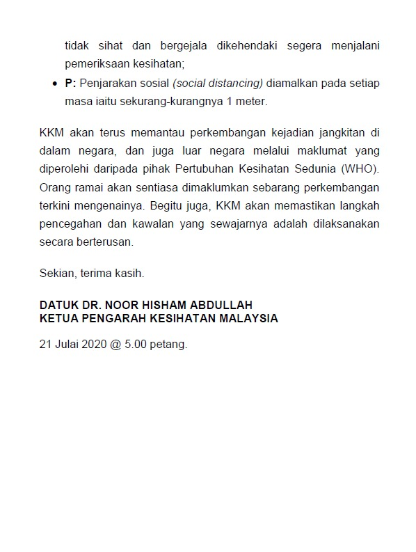 Kenyataan Media KP KKM 21/07/2020 0500 PM Asrul Siaran Media 21 July 2020 Hits: 1105 Rating: ( 0 Rating ) Please Rate Vote 1 Vote 2 Vote 3 Vote 4 Vote 5 Facebook Twitter Prev Next
