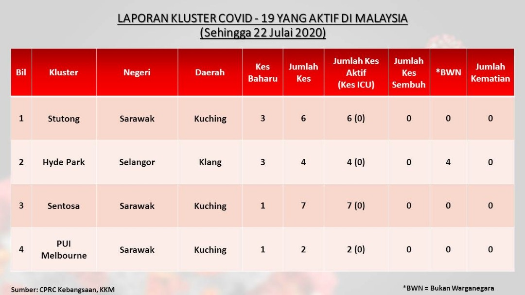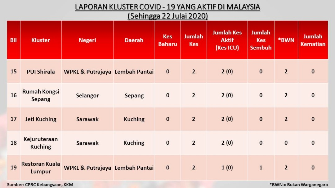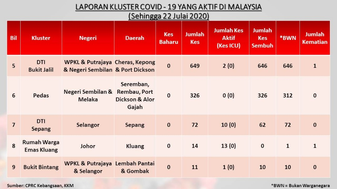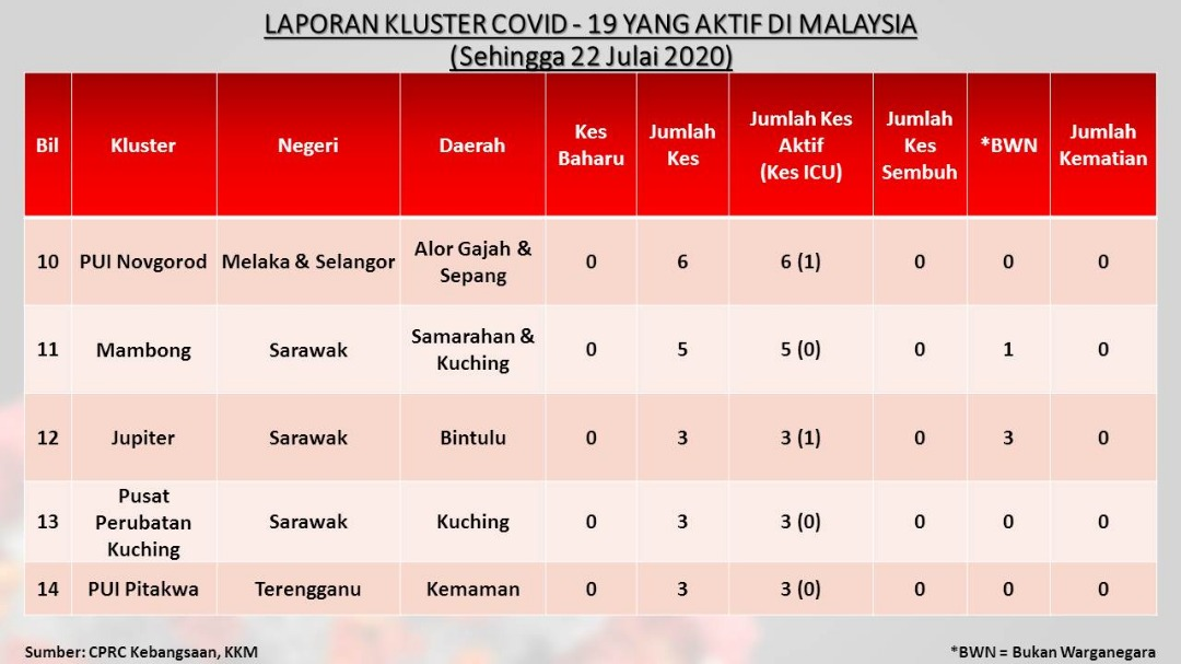Laporan Kluster COVID-19 Aktif Di Malaysia 22/07/2020 Asrul Siaran Media 22 July 2020 Hits: 897 Rating: ( 1 Rating ) User Rating: 5 / 5 Please Rate Vote 1 Vote 2 Vote 3 Vote 4 Vote 5 Facebook Twitter Prev Next