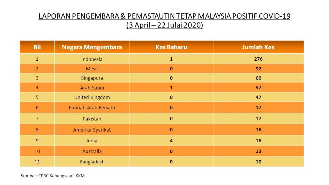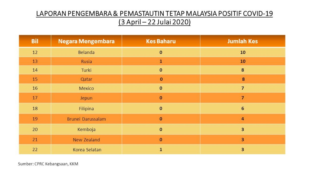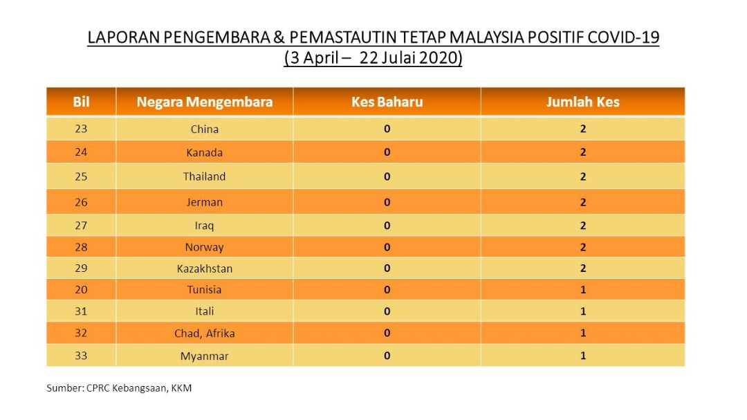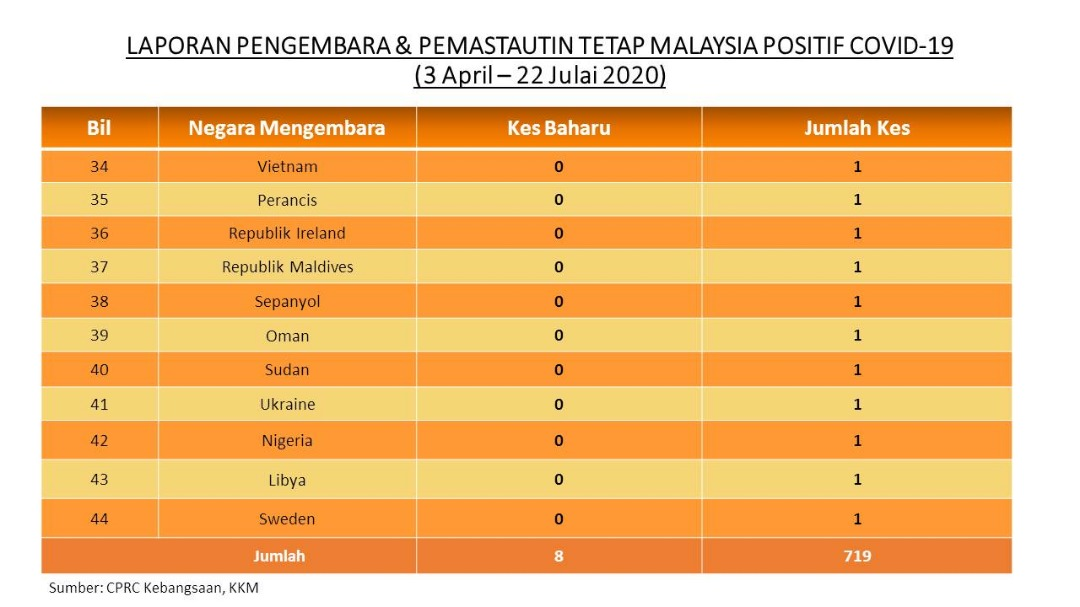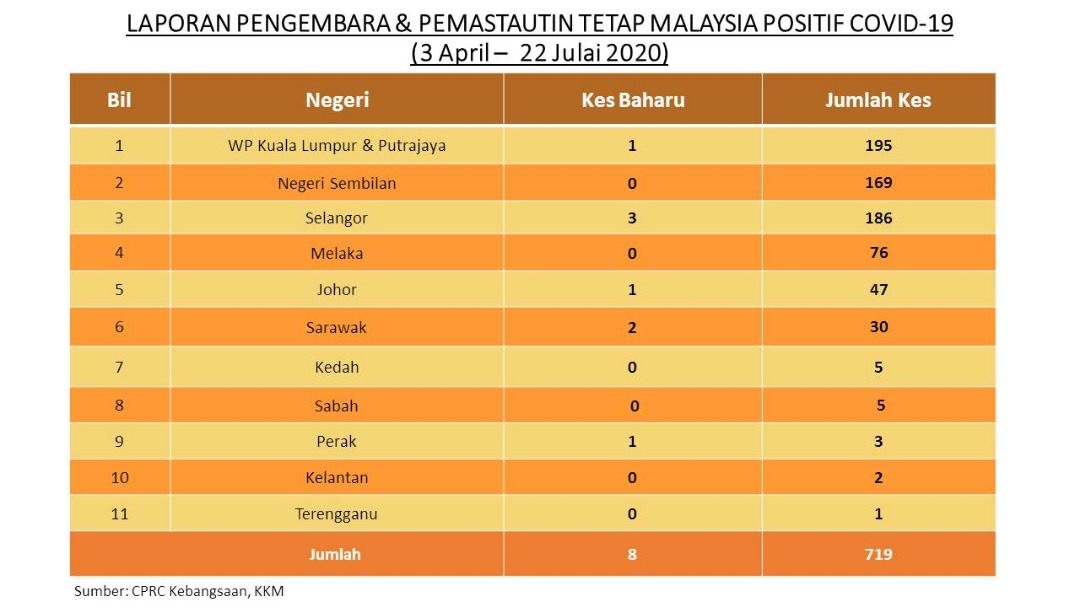 Laporan Pengembara & Pemastautin Tetap Malaysia Positif COVID-19 22/07/2020 Asrul Siaran Media 22 July 2020 Hits: 708 Rating: ( 1 Rating ) User Rating: 5 / 5 Please Rate Vote 1 Vote 2 Vote 3 Vote 4 Vote 5 Facebook Twitter Prev Next