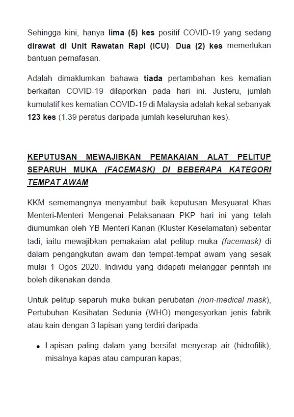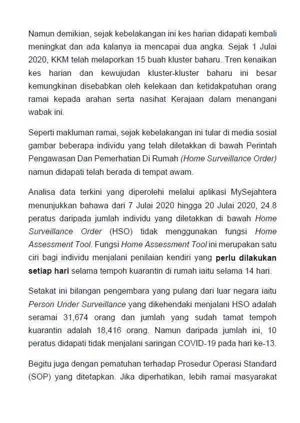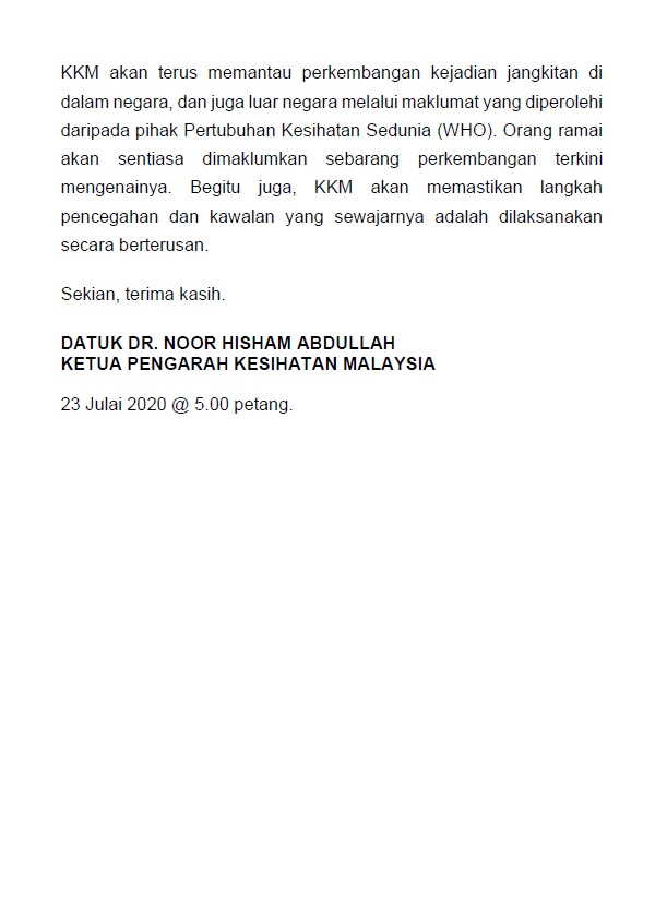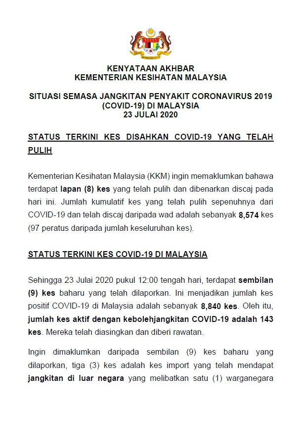 Kenyataan Media KP KKM 23/07/2020 0500 PM Asrul Siaran Media 23 July 2020 Hits: 1080 Rating: ( 0 Rating ) Please Rate Vote 1 Vote 2 Vote 3 Vote 4 Vote 5 Facebook Twitter Prev Next