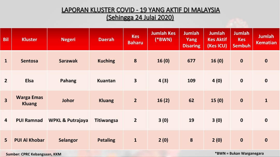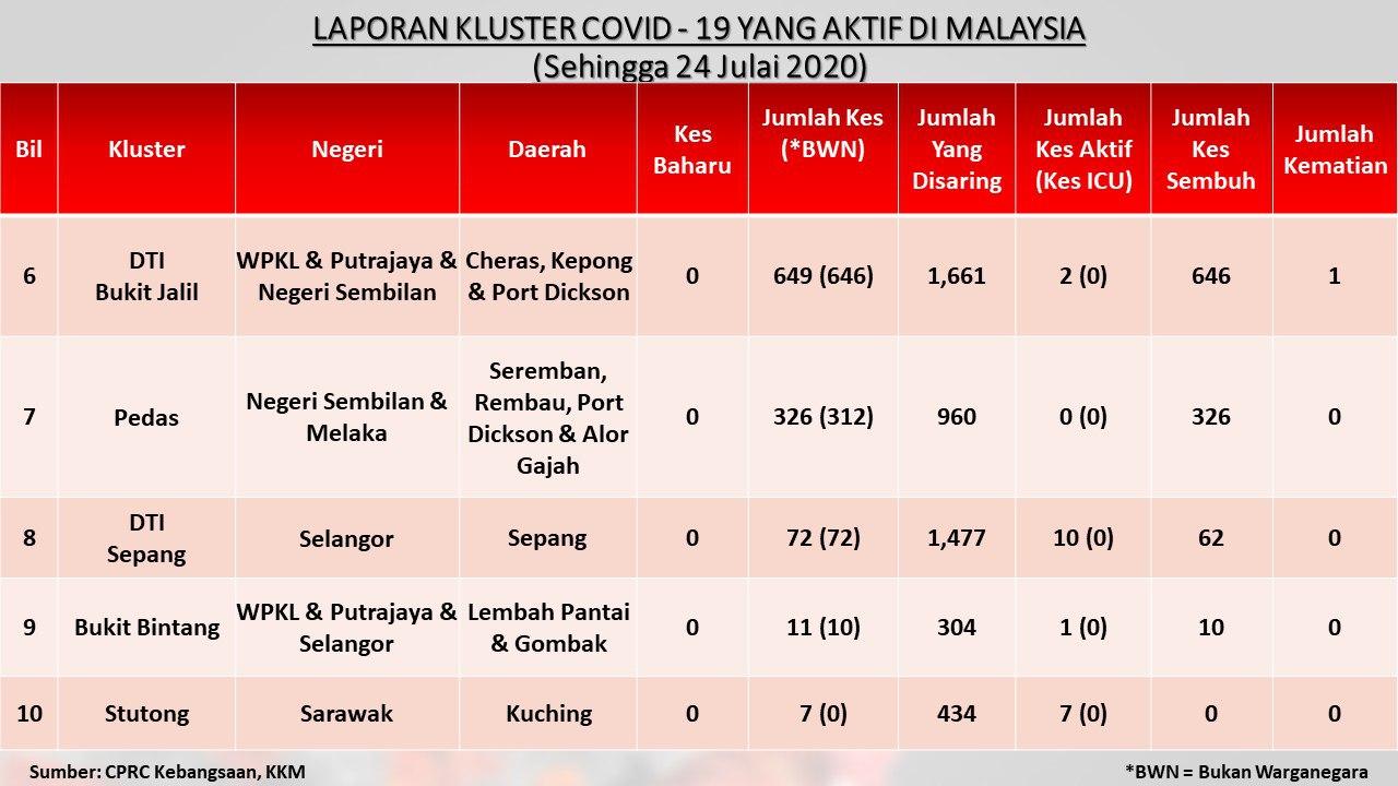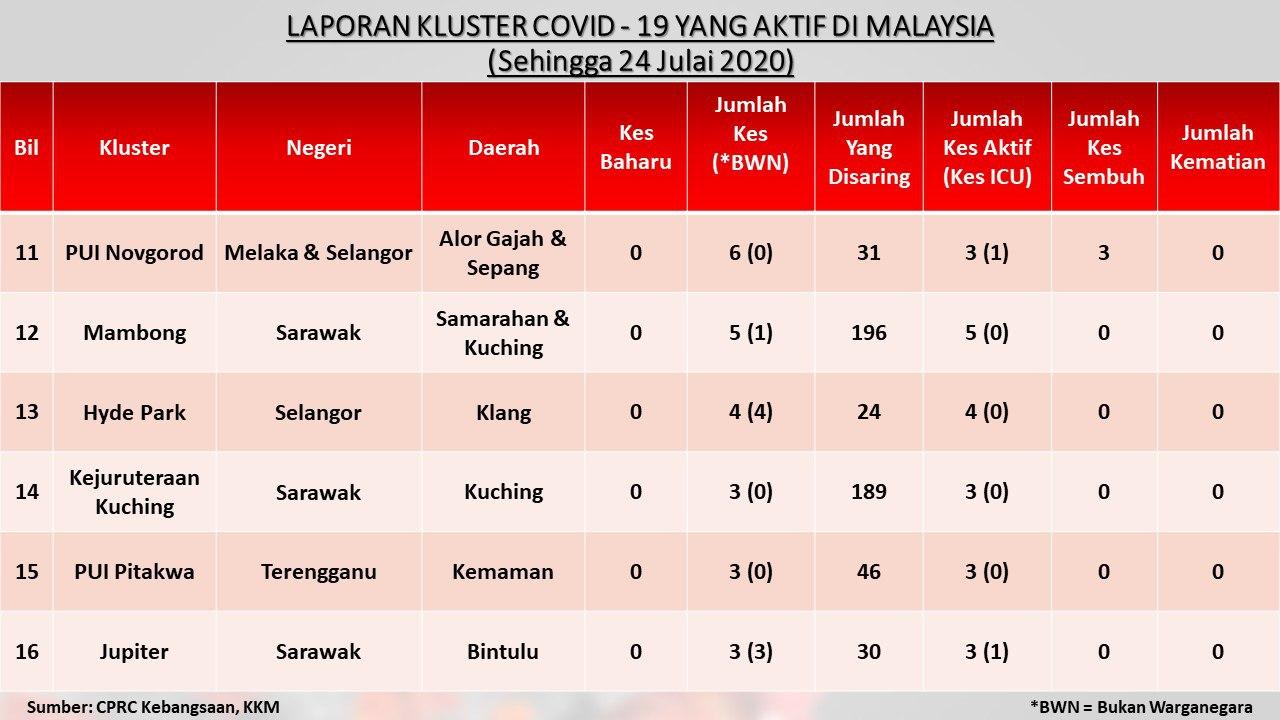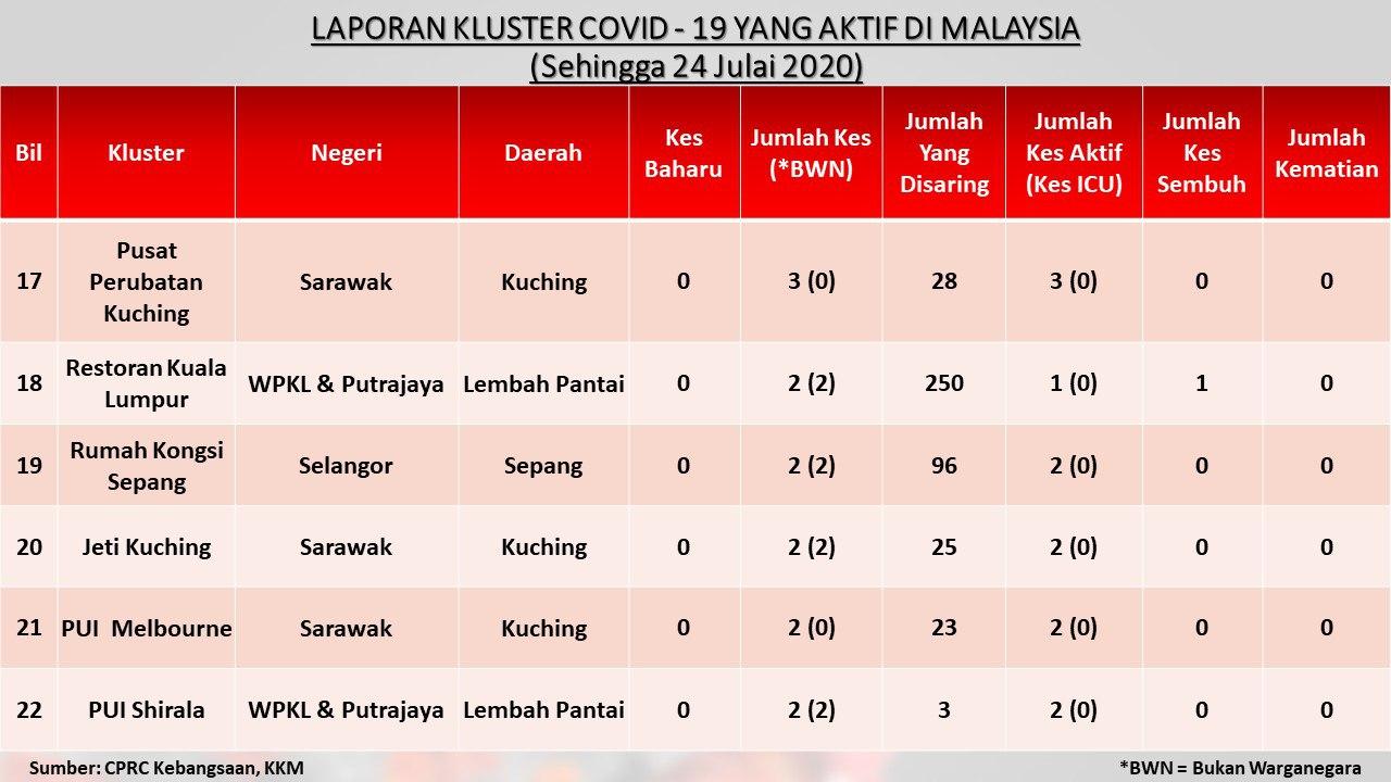 Laporan Kluster COVID-19 Aktif Di Malaysia 24/07/2020 Asrul Siaran Media 24 July 2020 Hits: 925 Rating: ( 0 Rating ) Please Rate Vote 1 Vote 2 Vote 3 Vote 4 Vote 5 Facebook Twitter Prev Next