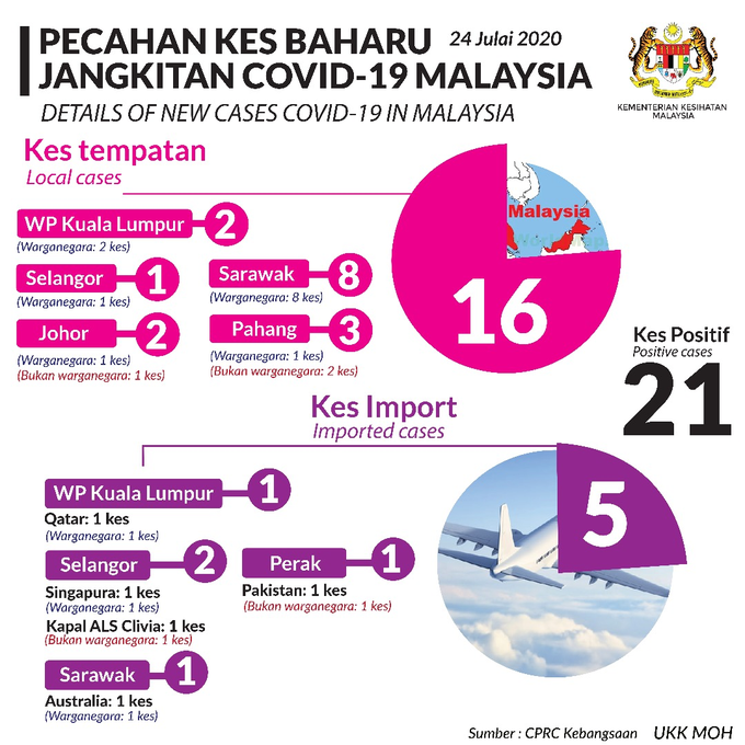 Statistik Pecahan Kes Baharu Jangkitan COVID-19 Malaysia 24/07/2020 Asrul Siaran Media 24 July 2020 Hits: 794 Rating: ( 0 Rating ) Please Rate Vote 1 Vote 2 Vote 3 Vote 4 Vote 5 Facebook Twitter Prev Next