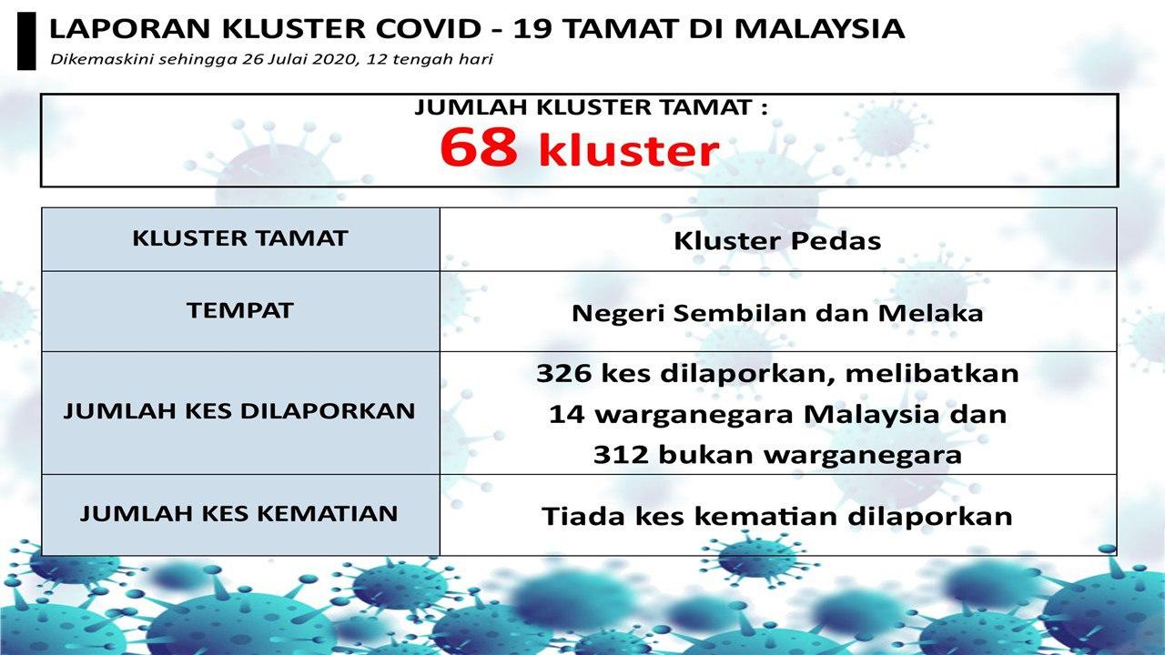 Laporan Kluster COVID-19 Tamat Di Malaysia 26/07/2020 1200 PM Asrul Siaran Media 26 July 2020 Hits: 717 Rating: ( 0 Rating ) Please Rate Vote 1 Vote 2 Vote 3 Vote 4 Vote 5 Facebook Twitter Prev Next