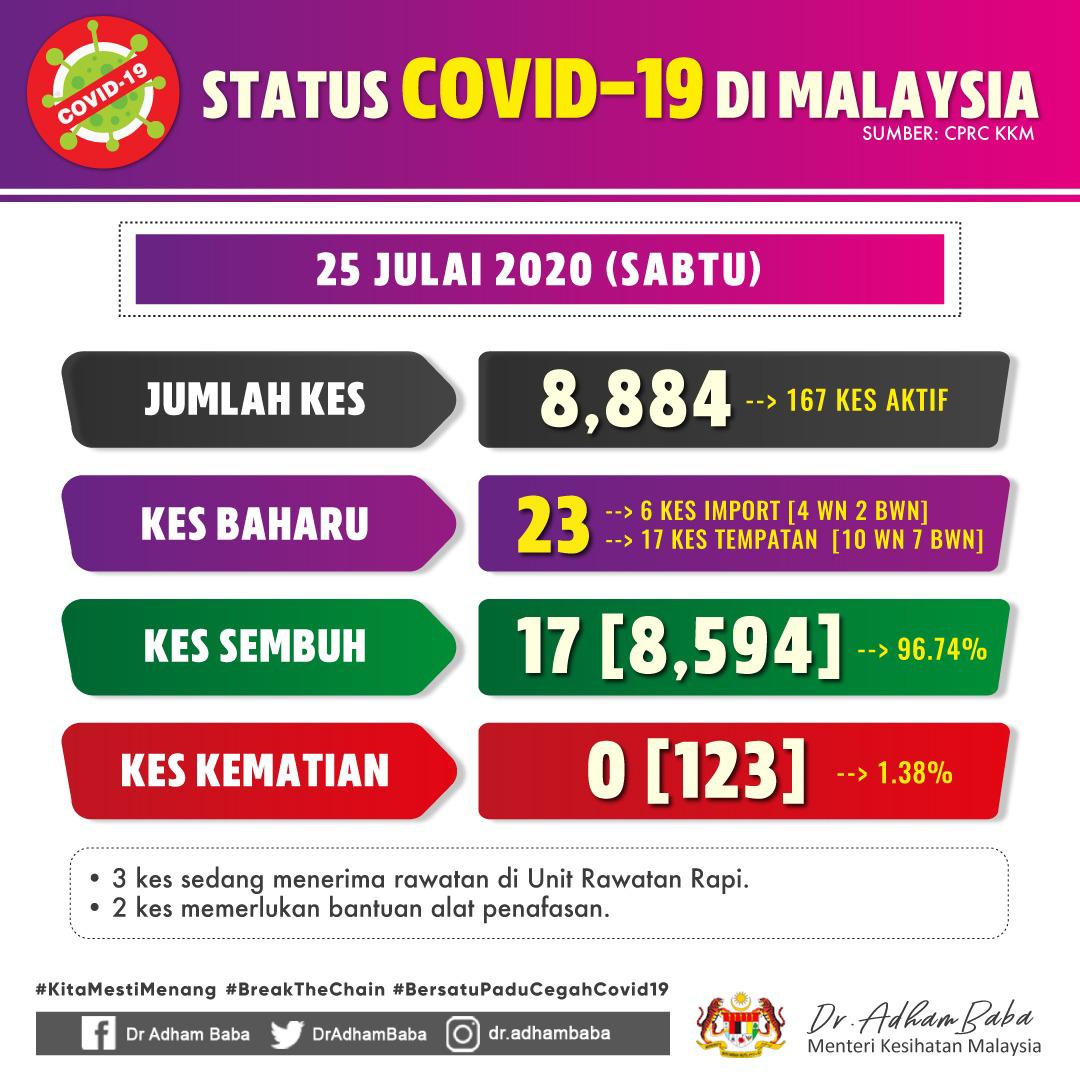 Status COVID-19 Di Malaysia 25/07/2020 Asrul Siaran Media 25 July 2020 Hits: 914 Rating: ( 0 Rating ) Please Rate Vote 1 Vote 2 Vote 3 Vote 4 Vote 5 Facebook Twitter Prev Next