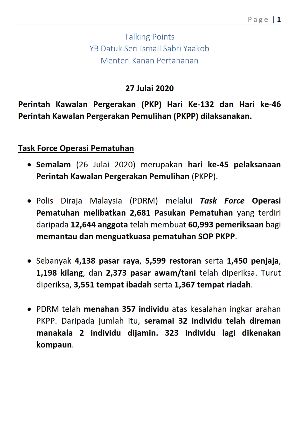 Talking Points Menteri Kanan Pertahanan 27/07/2020 Aiman Siaran Media 27 July 2020 Hits: 1688 Rating: ( 0 Rating ) Please Rate Vote 1 Vote 2 Vote 3 Vote 4 Vote 5 /images/ndcc/documents/covid19/siaranmedia202007/SIARAN_MEDIA_KKM_20200727_03.pdf Facebook Twitter Prev Next
