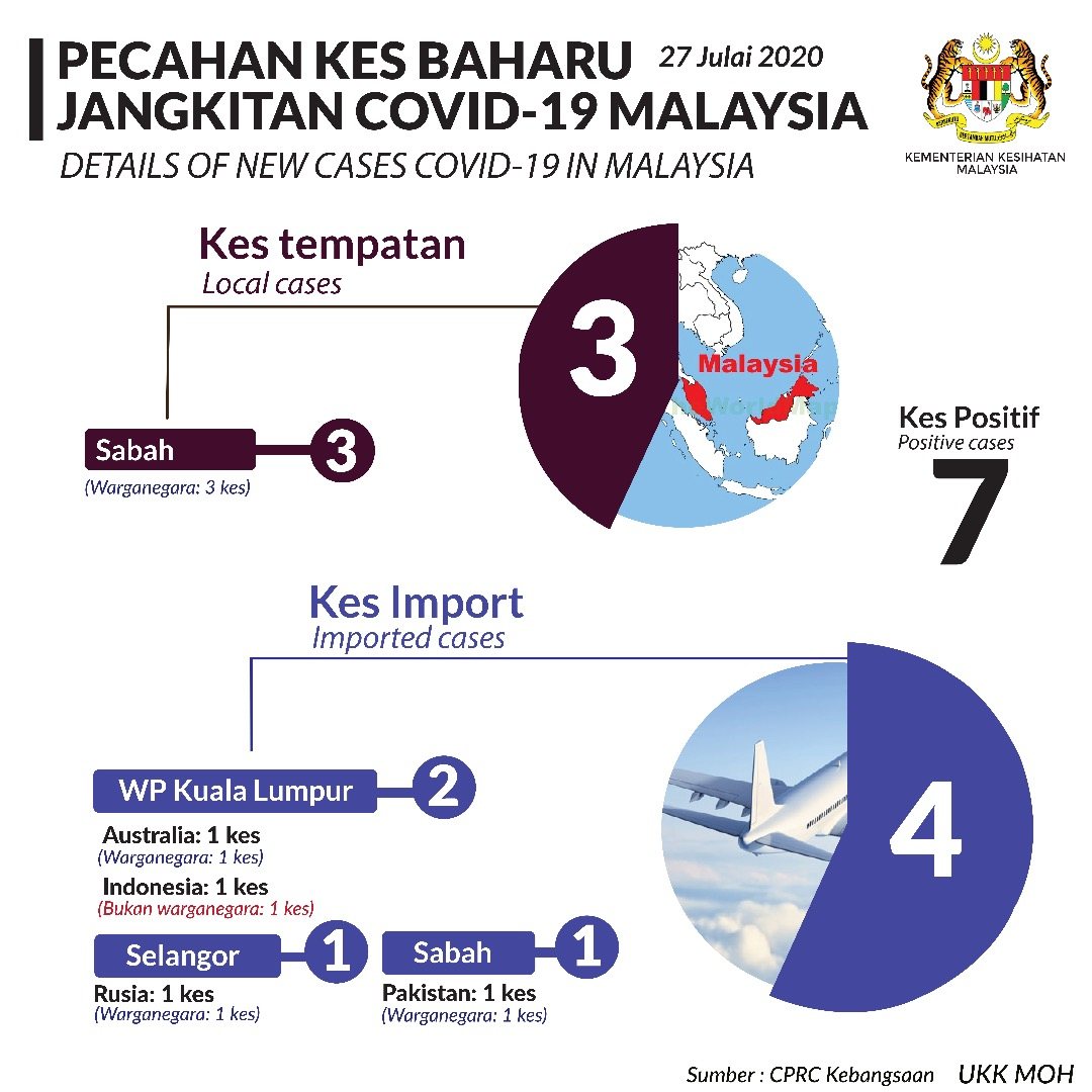 Statistik Pecahan Kes Baharu Jangkitan COVID-19 Malaysia 27/07/2020 Asrul Siaran Media 27 July 2020 Hits: 604 Rating: ( 0 Rating ) Please Rate Vote 1 Vote 2 Vote 3 Vote 4 Vote 5 Facebook Twitter Prev Next