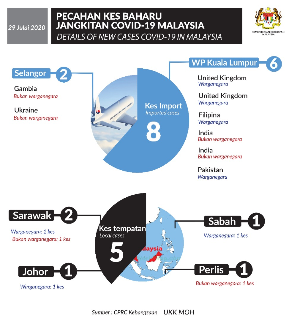 Statistik Pecahan Kes Baharu Jangkitan COVID-19 Malaysia 29/07/2020 Asrul Siaran Media 29 July 2020 Hits: 824 Rating: ( 0 Rating ) Please Rate Vote 1 Vote 2 Vote 3 Vote 4 Vote 5 Facebook Twitter Prev Next
