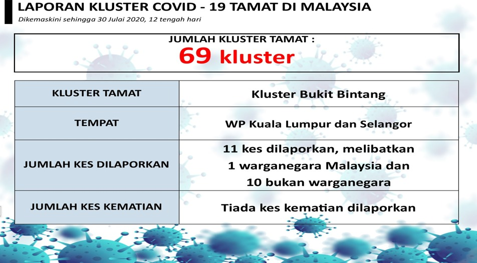 Laporan Kluster COVID-19 Tamat Di Malaysia 30/07/2020 1200 PM Asrul Siaran Media 30 July 2020 Hits: 751 Rating: ( 0 Rating ) Please Rate Vote 1 Vote 2 Vote 3 Vote 4 Vote 5 Facebook Twitter Prev Next