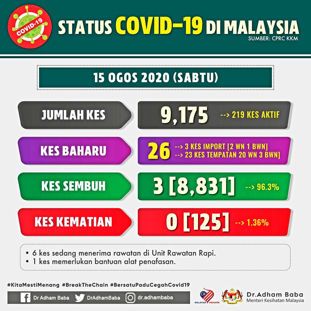 Status COVID-19 Di Malaysia 15/08/2020 Asrul Siaran Media 15 August 2020 Hits: 644 Rating: ( 0 Rating ) Please Rate Vote 1 Vote 2 Vote 3 Vote 4 Vote 5 Facebook Twitter Prev Next