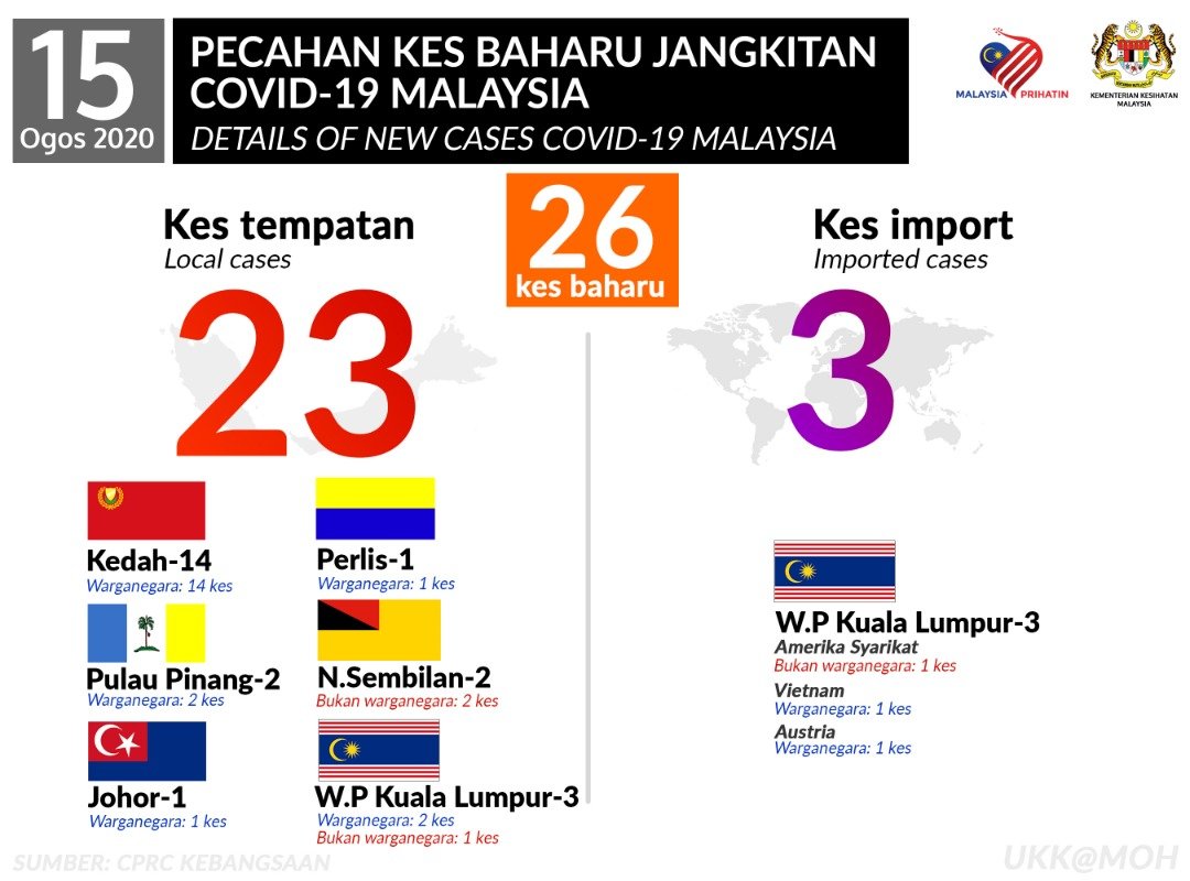 Statistik Pecahan Kes Baharu Jangkitan COVID-19 Malaysia 15/08/2020 Asrul Siaran Media 15 August 2020 Hits: 923 Rating: ( 0 Rating ) Please Rate Vote 1 Vote 2 Vote 3 Vote 4 Vote 5 Facebook Twitter Prev Next
