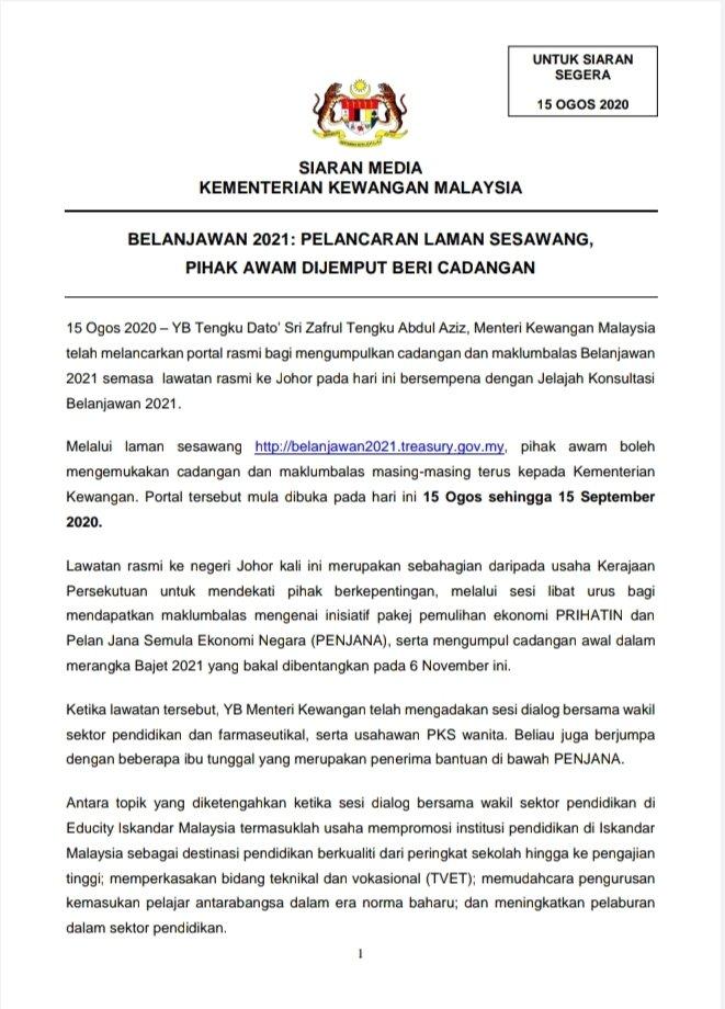 Kenyataan Media Menteri Kewangan Malaysia 15/08/2020 0500 PM Asrul Siaran Media 15 August 2020 Hits: 1047 Rating: ( 0 Rating ) Please Rate Vote 1 Vote 2 Vote 3 Vote 4 Vote 5 Facebook Twitter Prev Next