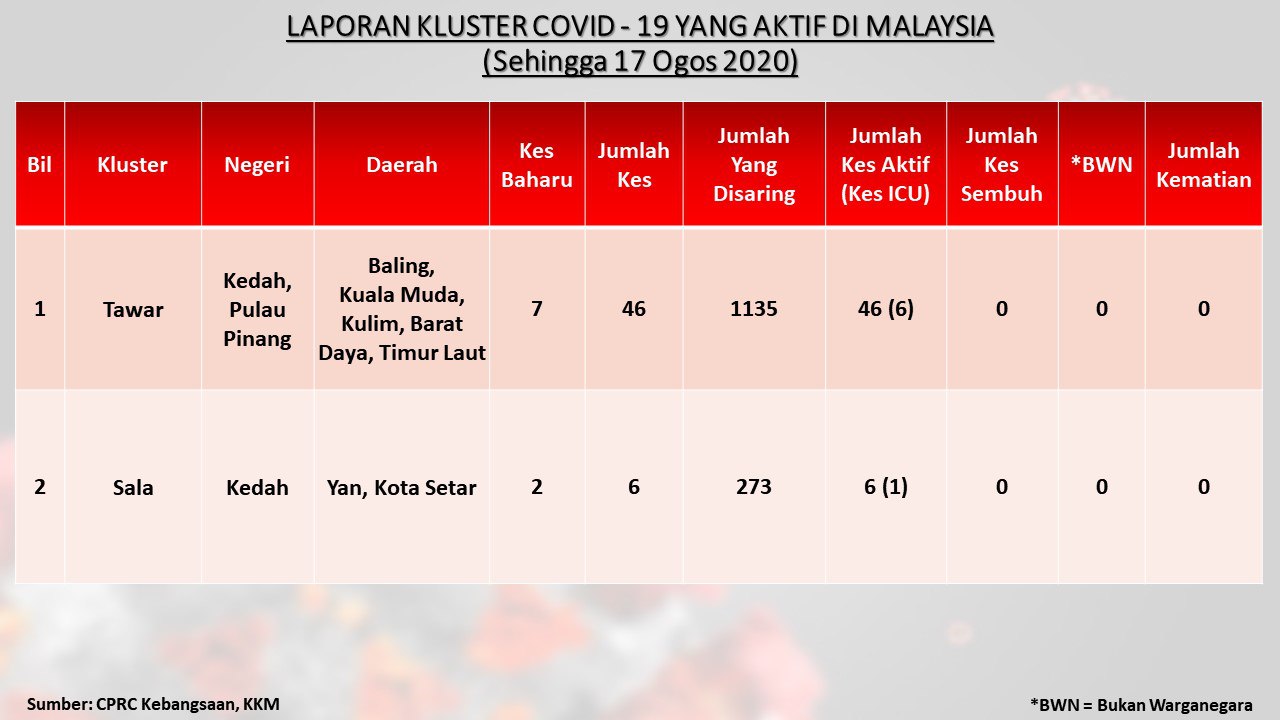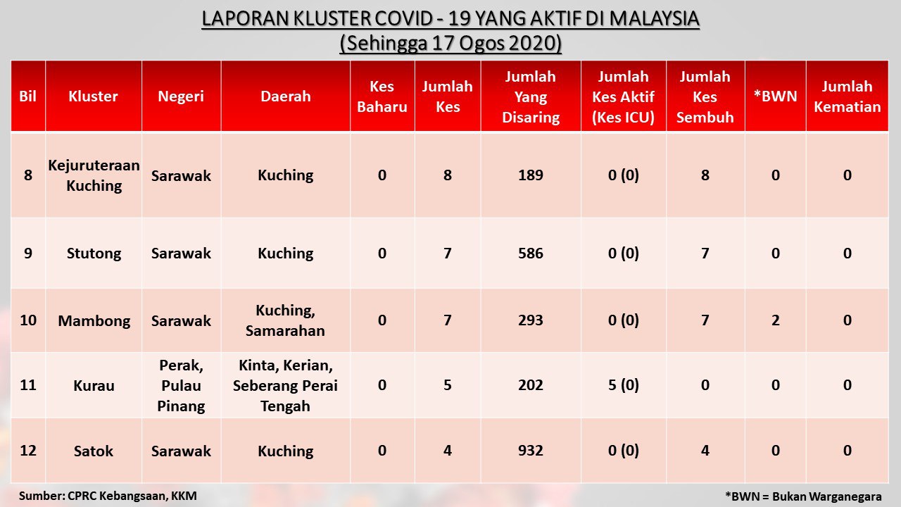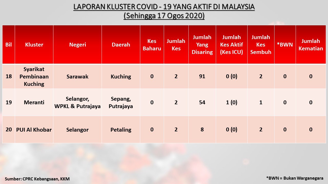 Laporan Kluster COVID-19 Aktif Di Malaysia 17/08/2020 Aiman Siaran Media 17 August 2020 Hits: 784 Rating: ( 0 Rating ) Please Rate Vote 1 Vote 2 Vote 3 Vote 4 Vote 5 Facebook Twitter Prev Next