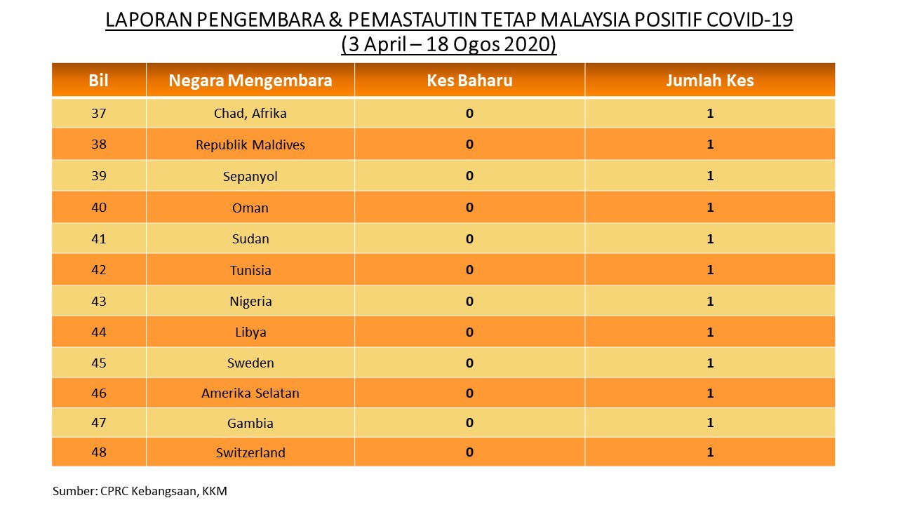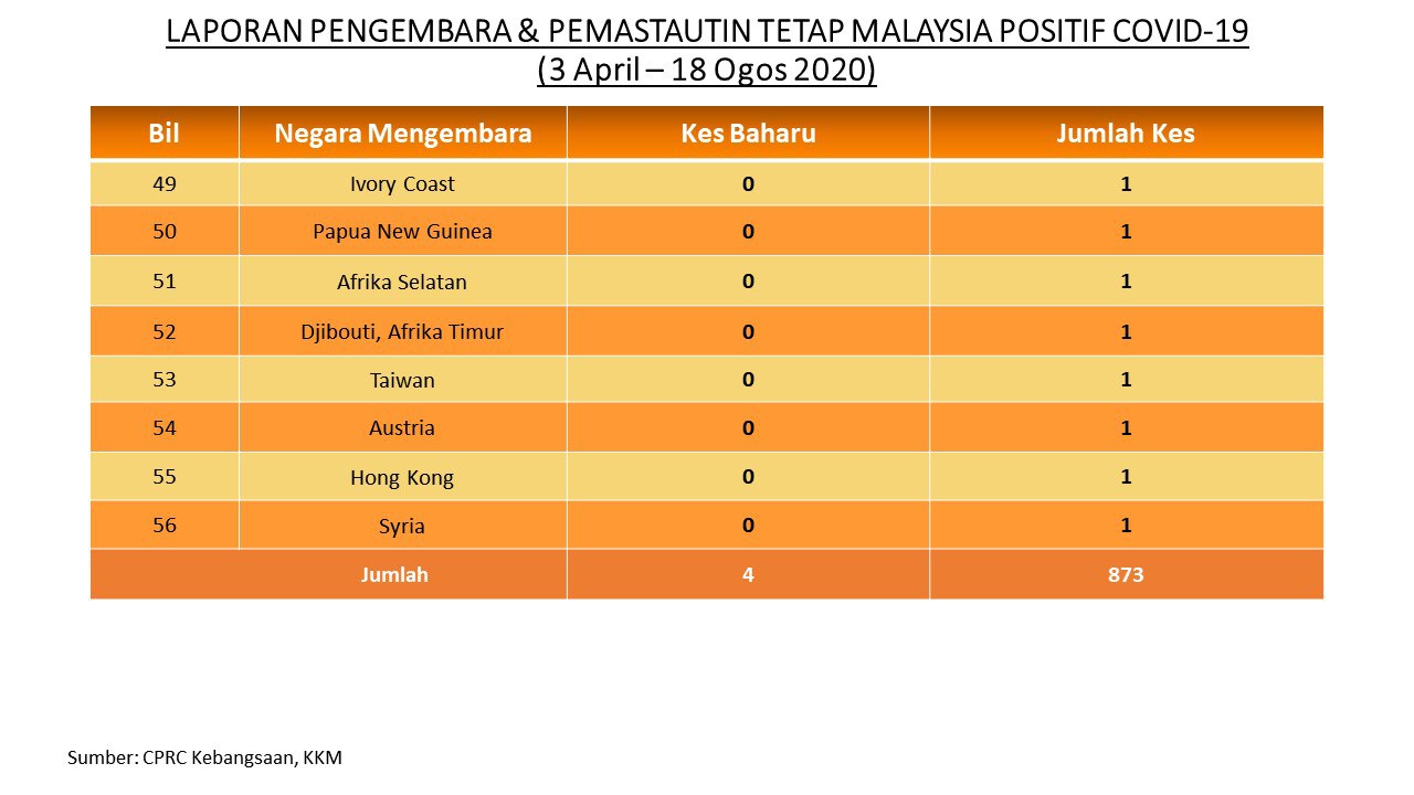 Laporan Pengembara & Pemastautin Tetap Malaysia Positif COVID-19 18/08/2020 Aiman Siaran Media 18 August 2020 Hits: 771 Rating: ( 0 Rating ) Please Rate Vote 1 Vote 2 Vote 3 Vote 4 Vote 5 Facebook Twitter Prev Next