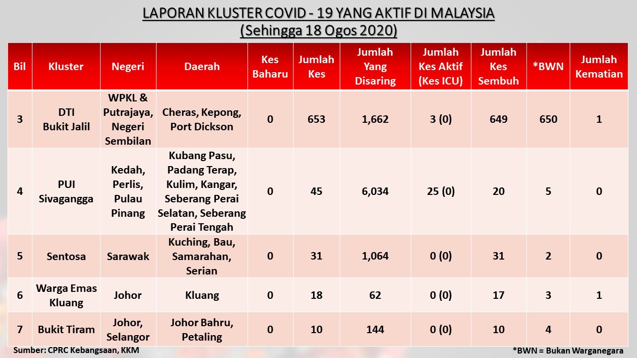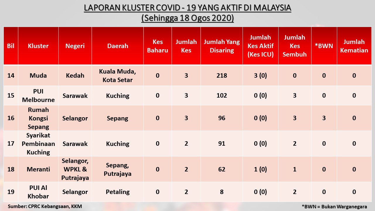 Laporan Kluster COVID-19 Aktif Di Malaysia 18/08/2020 Aiman Siaran Media 18 August 2020 Hits: 1023 Rating: ( 0 Rating ) Please Rate Vote 1 Vote 2 Vote 3 Vote 4 Vote 5 Facebook Twitter Prev Next
