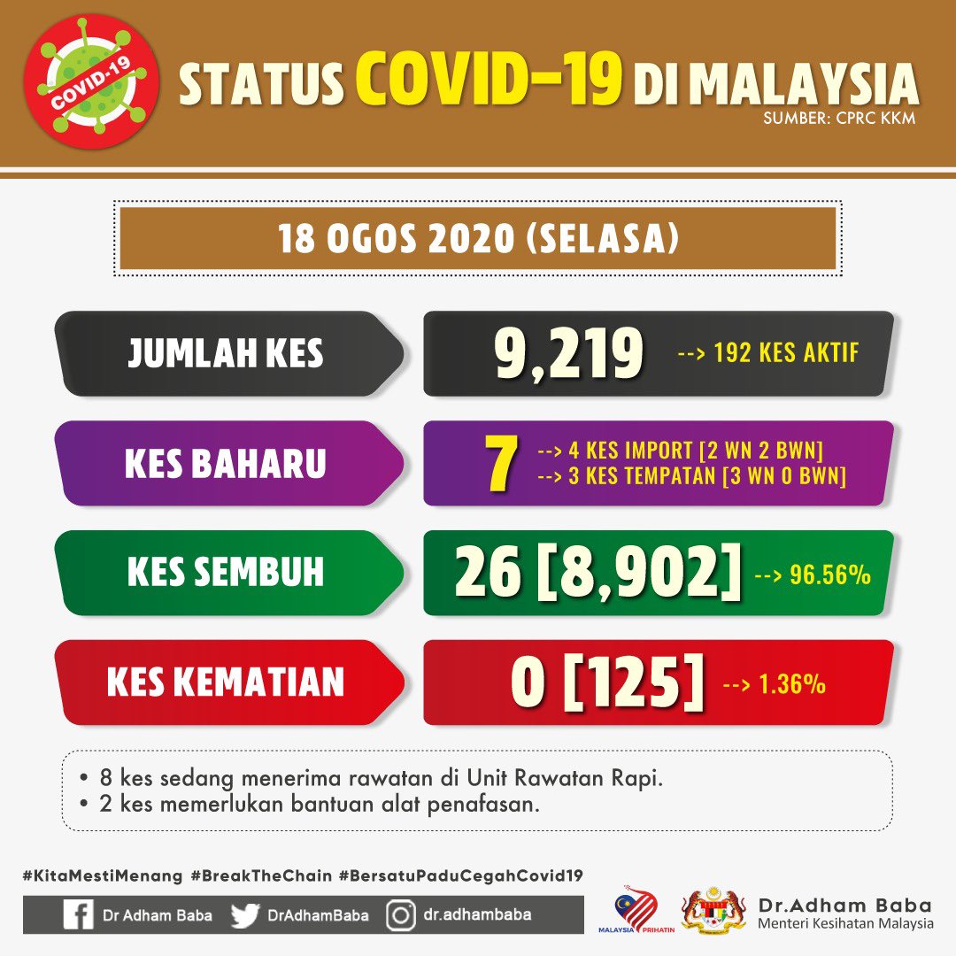 Status COVID-19 Di Malaysia 18/08/2020 Asrul Siaran Media 18 August 2020 Hits: 876 Rating: ( 0 Rating ) Please Rate Vote 1 Vote 2 Vote 3 Vote 4 Vote 5 Facebook Twitter Prev Next