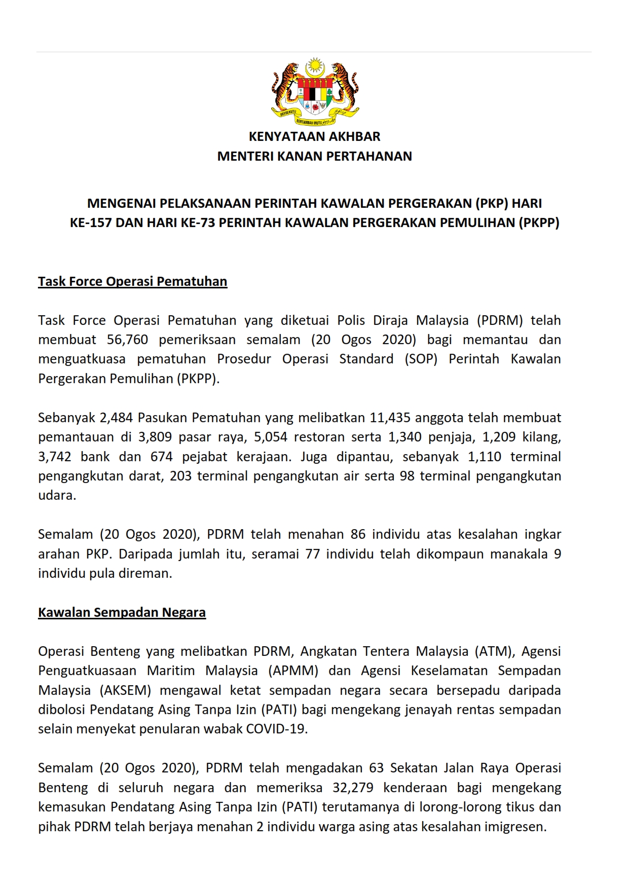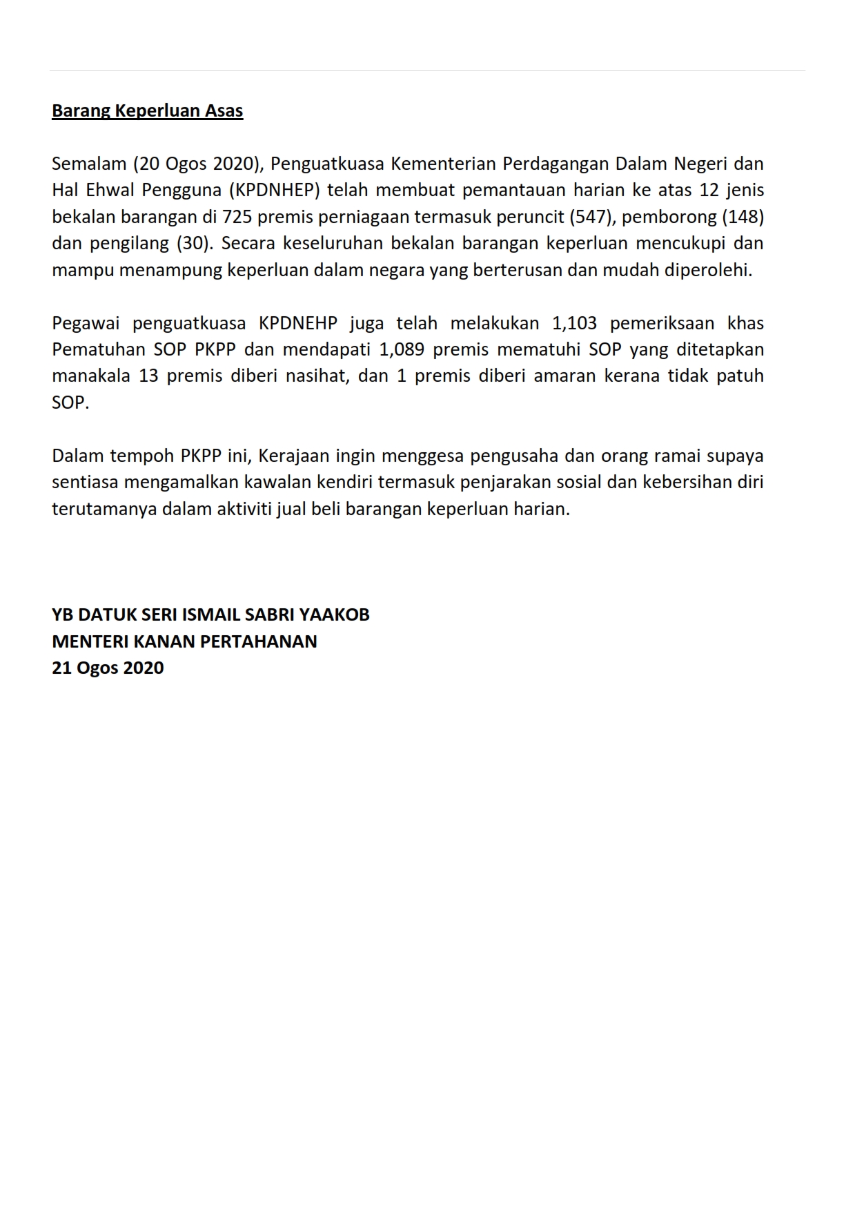 Kenyataan Akhbar Menteri Kanan Pertahanan 21/08/2020 0200 PM Aiman Siaran Media 21 August 2020 Hits: 818 Rating: ( 0 Rating ) Please Rate Vote 1 Vote 2 Vote 3 Vote 4 Vote 5 Facebook Twitter Prev Next