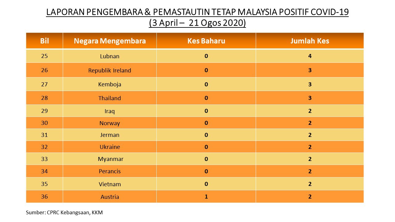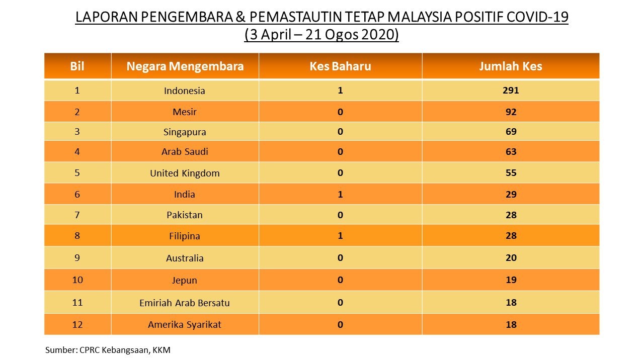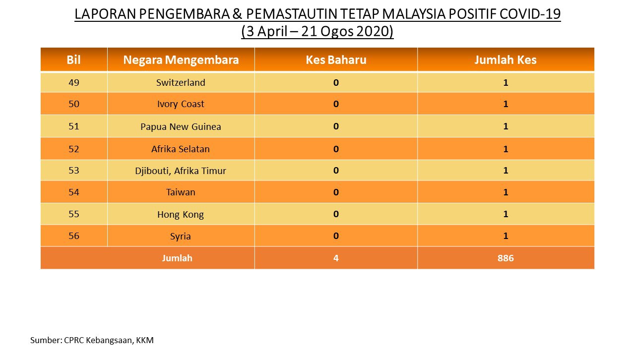 Laporan Pengembara & Pemastautin Tetap Malaysia Positif COVID-19 21/08/2020 Aiman Siaran Media 21 August 2020 Hits: 944 Rating: ( 0 Rating ) Please Rate Vote 1 Vote 2 Vote 3 Vote 4 Vote 5 Facebook Twitter Prev Next