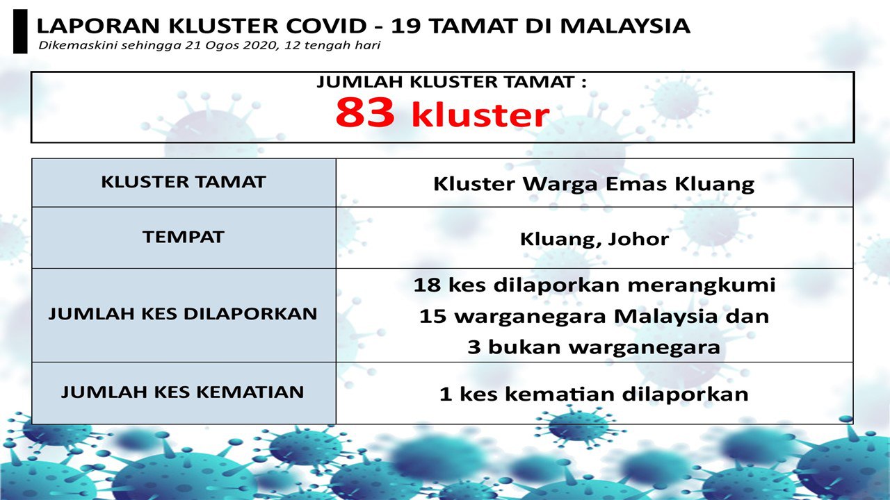 Laporan Kluster COVID-19 Tamat Di Malaysia 21/08/2020 1200 PM Aiman Siaran Media 21 August 2020 Hits: 1020 Rating: ( 0 Rating ) Please Rate Vote 1 Vote 2 Vote 3 Vote 4 Vote 5 Facebook Twitter Prev Next