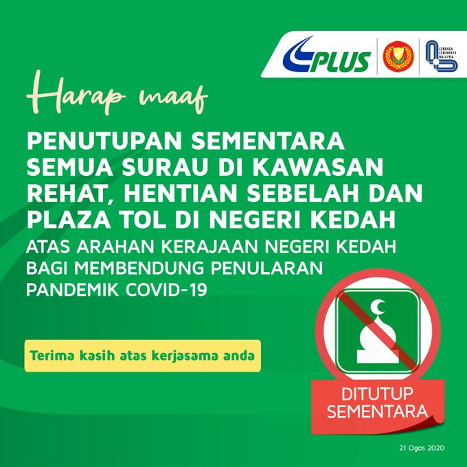 Penutupan Sementara Semua Surau Di Kawasan R&R , Hentian Sebelah & Plaza Tol Di Negeri Kedah 21/08/2020 Asrul Siaran Media 21 August 2020 Hits: 617 Rating: ( 0 Rating ) Please Rate Vote 1 Vote 2 Vote 3 Vote 4 Vote 5 Facebook Twitter Prev Next