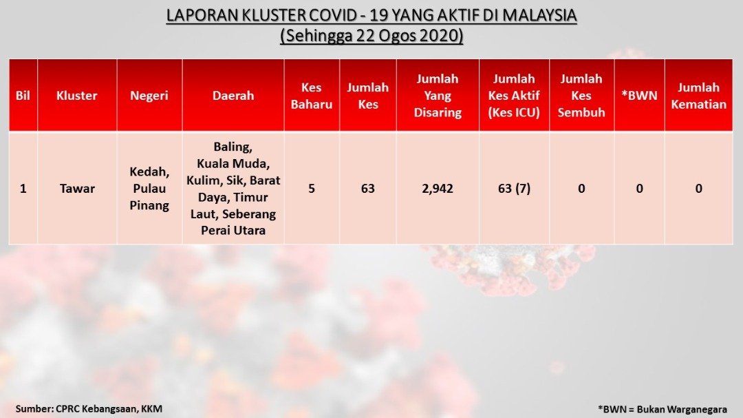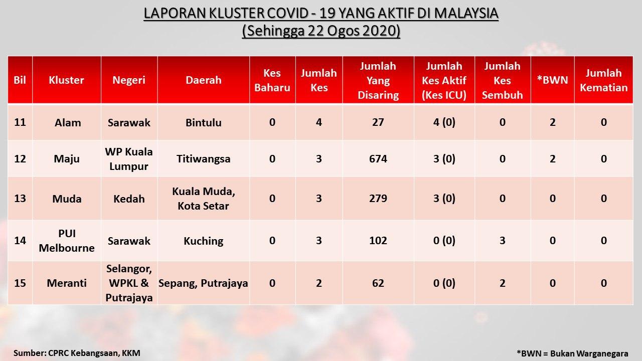Laporan Kluster COVID-19 Aktif Di Malaysia 22/08/2020 Asrul Siaran Media 22 August 2020 Hits: 856 Rating: ( 0 Rating ) Please Rate Vote 1 Vote 2 Vote 3 Vote 4 Vote 5 Facebook Twitter Prev Next
