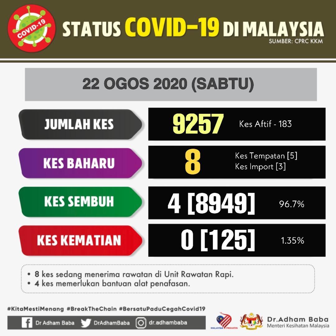 Status COVID-19 Di Malaysia 22/08/2020 Asrul Siaran Media 22 August 2020 Hits: 593 Rating: ( 0 Rating ) Please Rate Vote 1 Vote 2 Vote 3 Vote 4 Vote 5 Facebook Twitter Prev Next