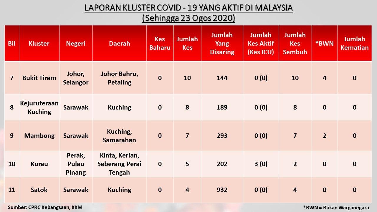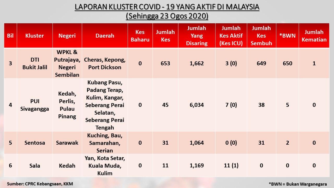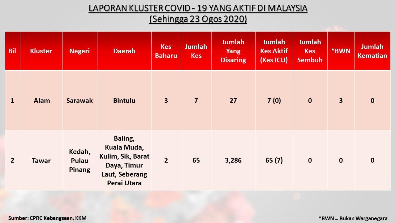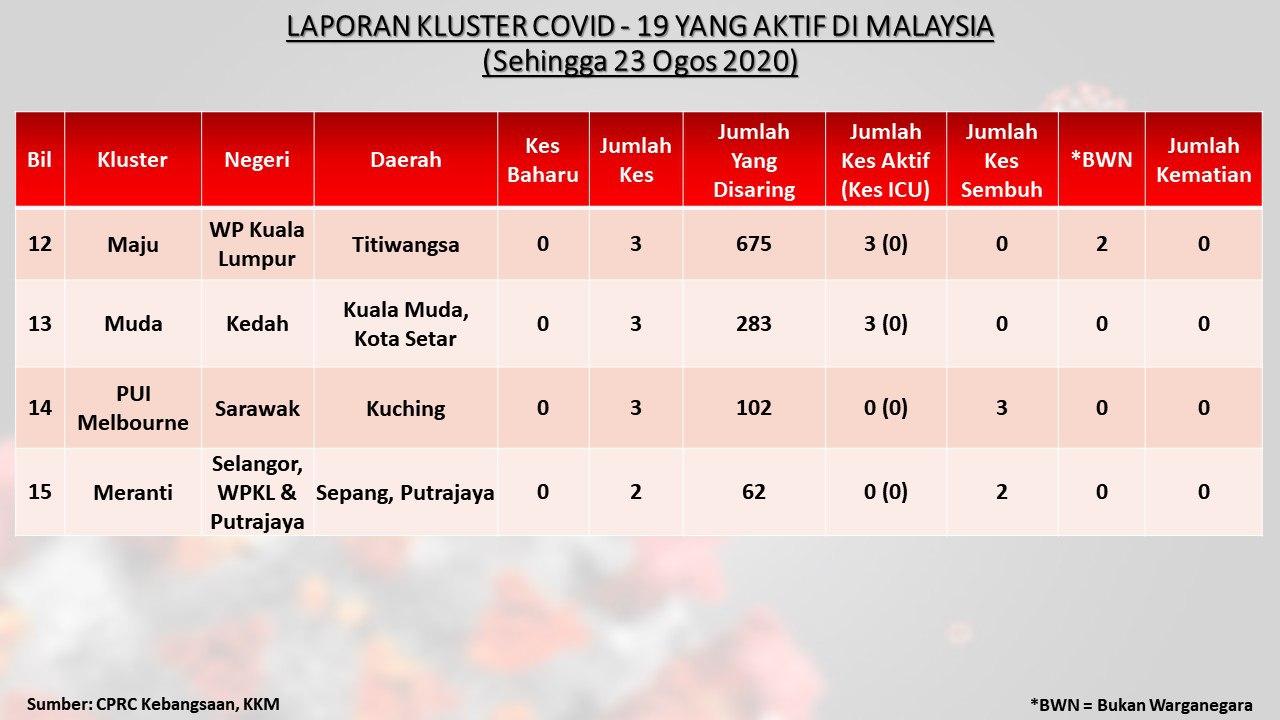 Laporan Kluster COVID-19 Aktif Di Malaysia 23/08/2020 Aiman Siaran Media 23 August 2020 Hits: 709 Rating: ( 0 Rating ) Please Rate Vote 1 Vote 2 Vote 3 Vote 4 Vote 5 Facebook Twitter Prev Next