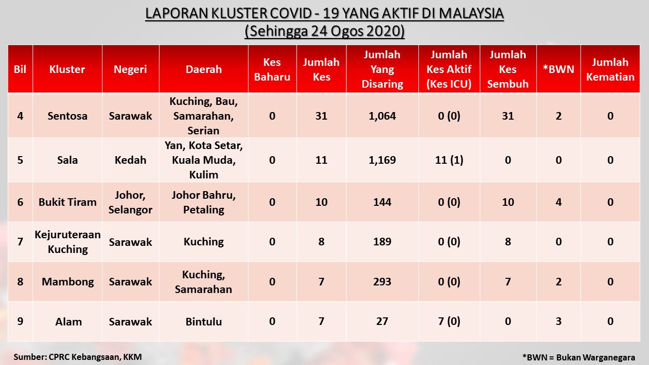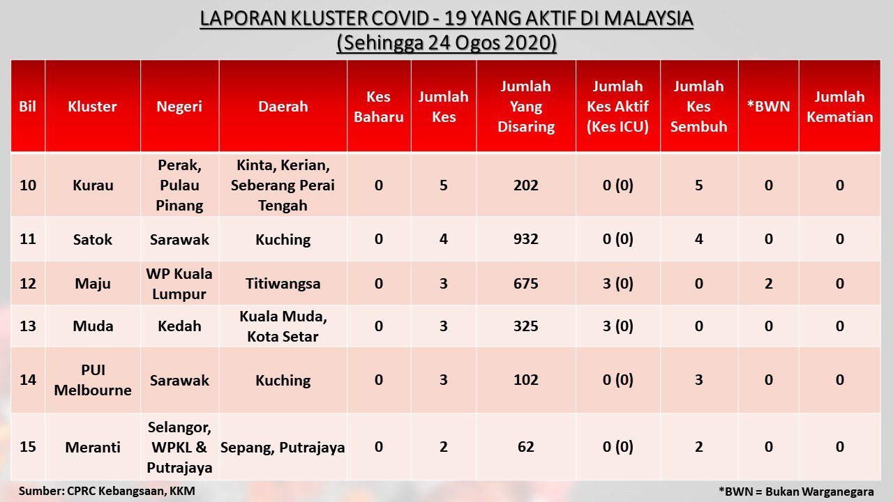 Laporan Kluster COVID-19 Aktif Di Malaysia 24/08/2020 Aiman Siaran Media 24 August 2020 Hits: 874 Rating: ( 0 Rating ) Please Rate Vote 1 Vote 2 Vote 3 Vote 4 Vote 5 Facebook Twitter Prev Next