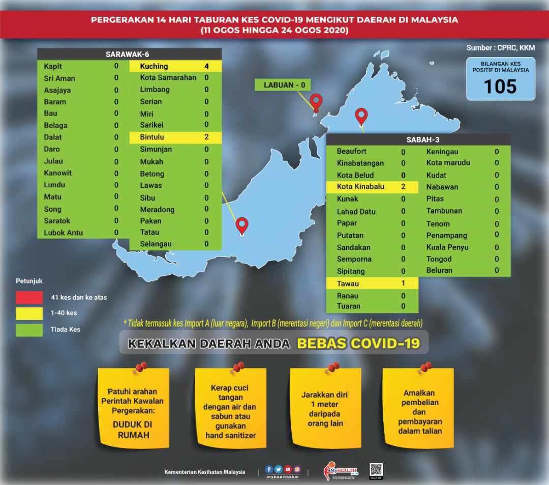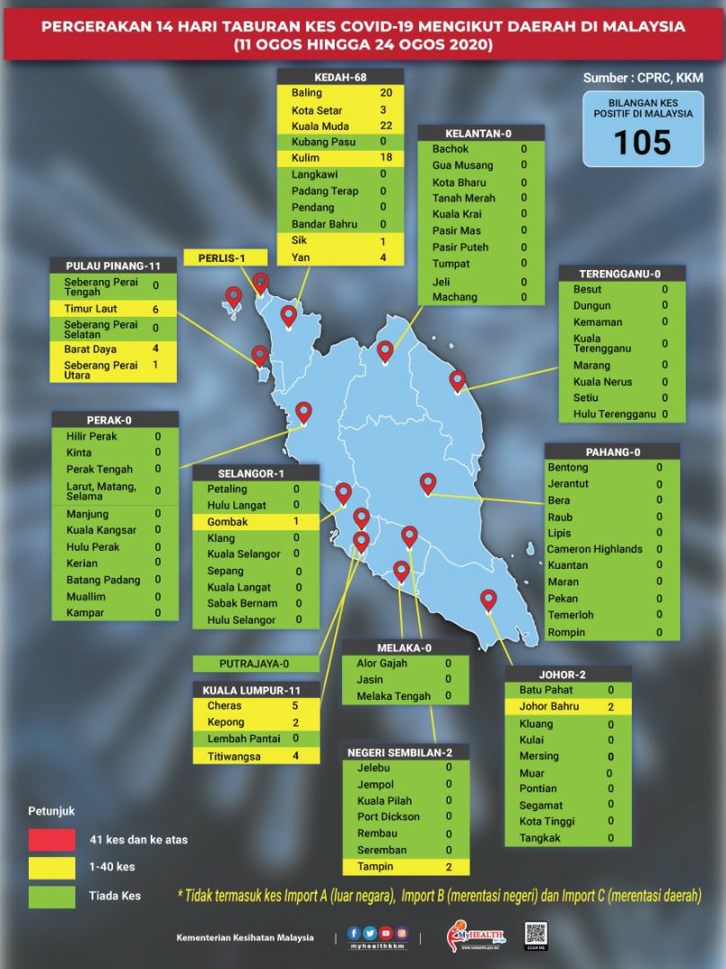 Pergerakan 14 Hari Taburan Kes COVID-19 Mengikut Daerah Di Malaysia 24/08/2020 Aiman Siaran Media 24 August 2020 Hits: 977 Rating: ( 0 Rating ) Please Rate Vote 1 Vote 2 Vote 3 Vote 4 Vote 5 Facebook Twitter Prev Next