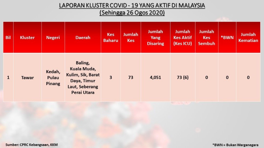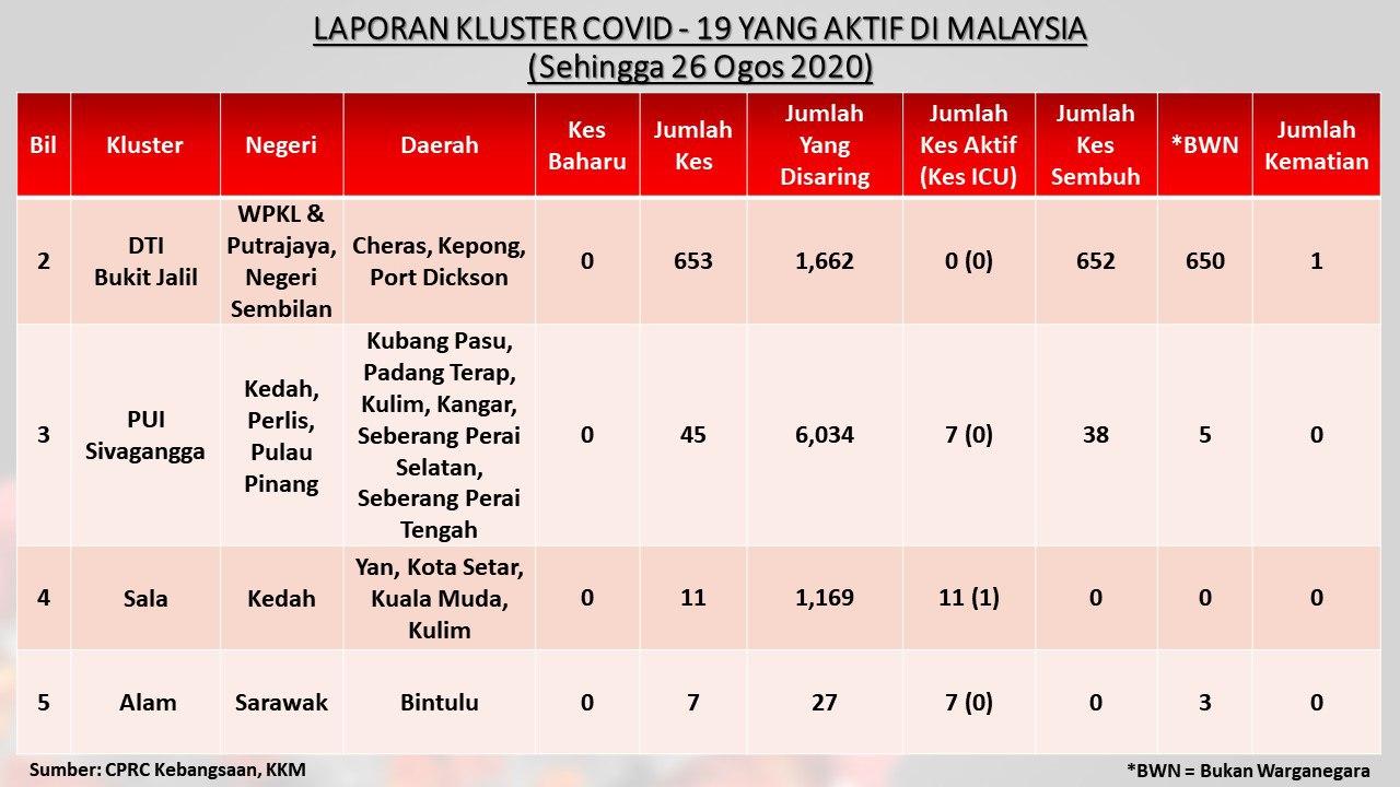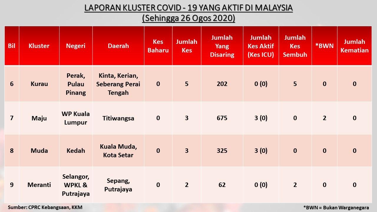 Laporan Kluster COVID-19 Aktif Di Malaysia 26/08/2020 Asrul Siaran Media 26 August 2020 Hits: 763 Rating: ( 0 Rating ) Please Rate Vote 1 Vote 2 Vote 3 Vote 4 Vote 5 Facebook Twitter Prev Next
