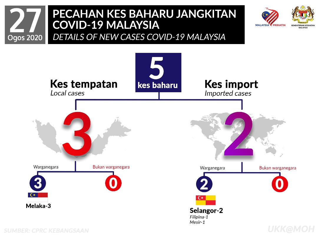 Statistik Pecahan Kes Baharu Jangkitan COVID-19 Malaysia 27/08/2020 Asrul Siaran Media 27 August 2020 Hits: 1111 Rating: ( 0 Rating ) Please Rate Vote 1 Vote 2 Vote 3 Vote 4 Vote 5 Facebook Twitter Prev Next