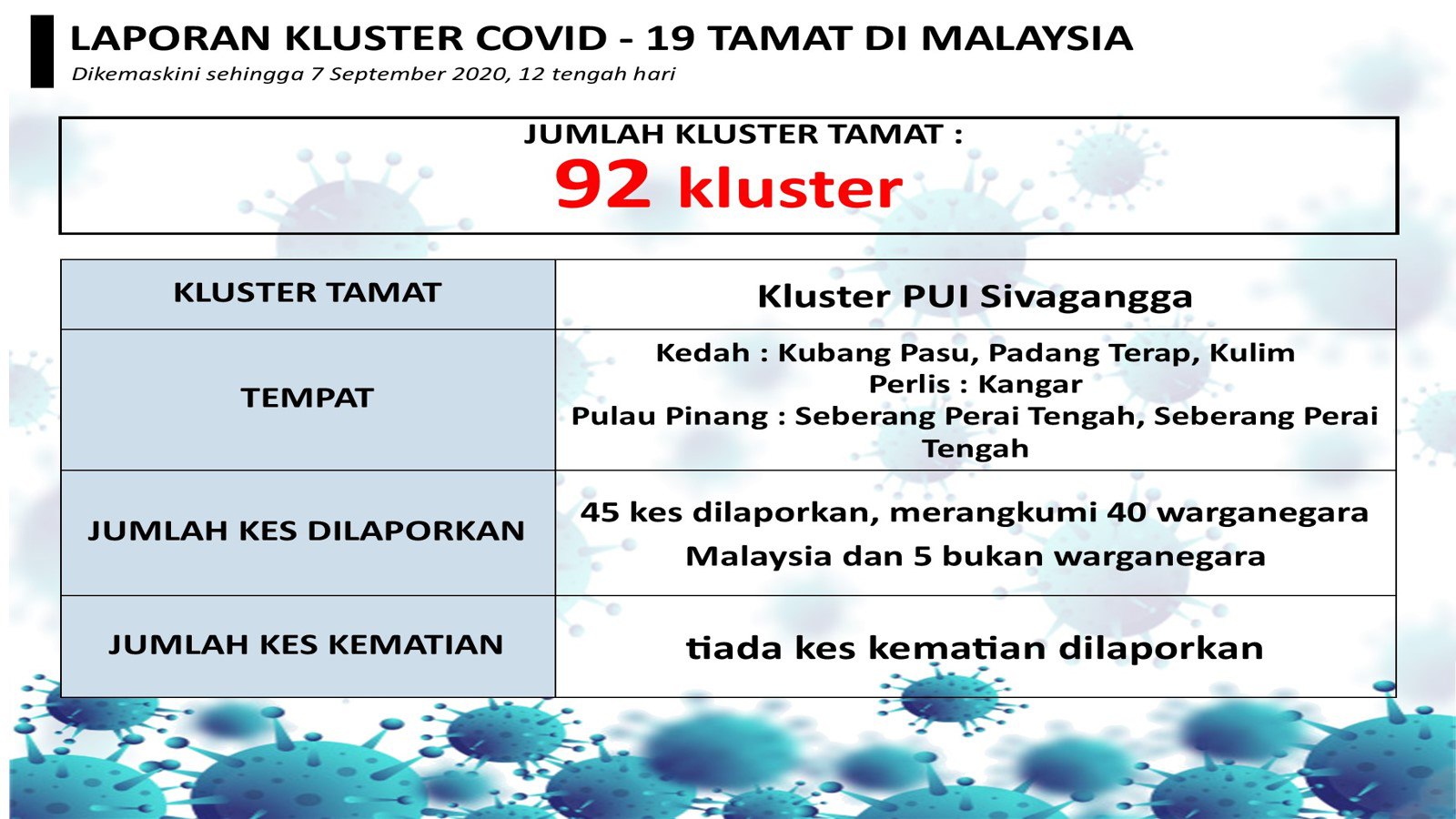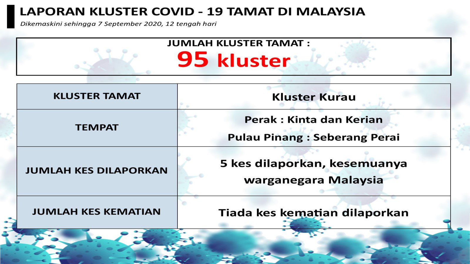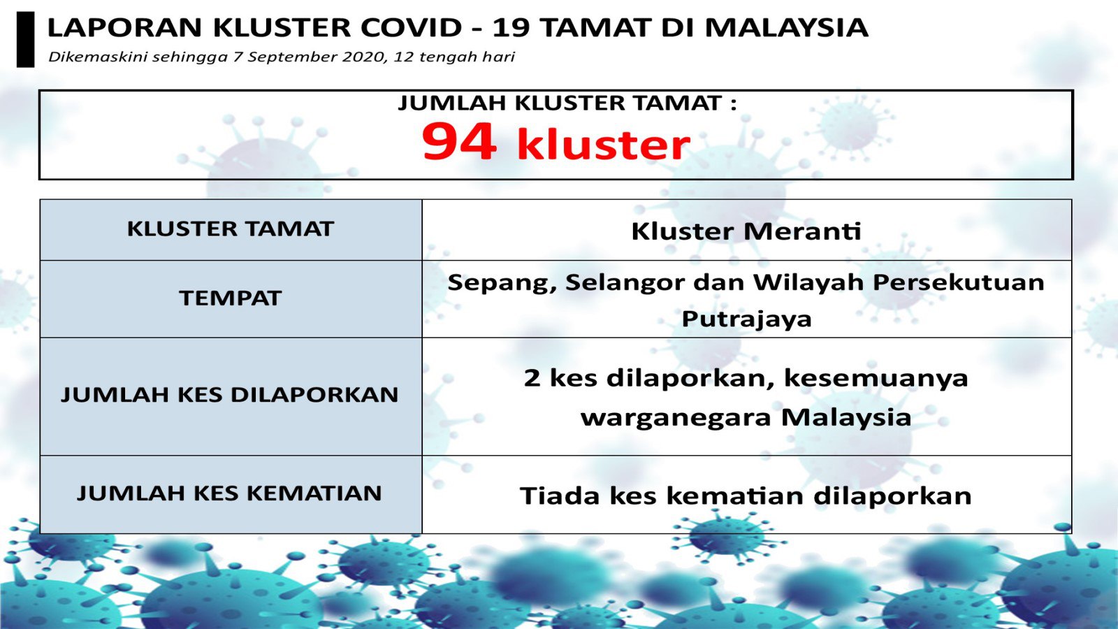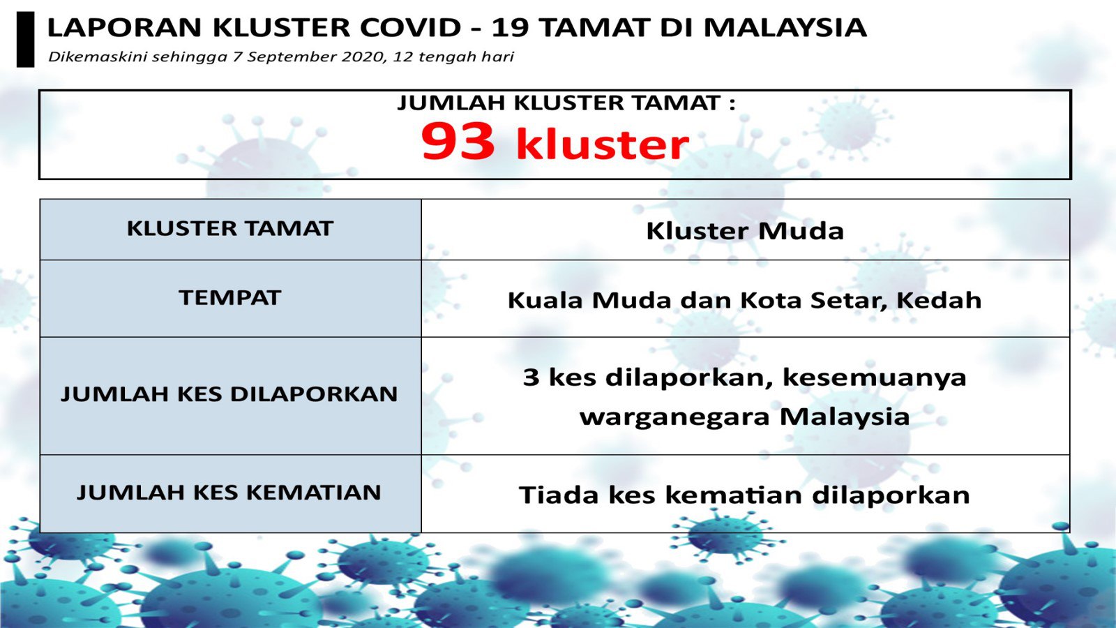 Laporan Kluster COVID-19 Tamat Di Malaysia 07/09/2020 1200 PM Aiman Siaran Media 07 September 2020 Hits: 662 Rating: ( 0 Rating ) Please Rate Vote 1 Vote 2 Vote 3 Vote 4 Vote 5 Facebook Twitter Prev Next