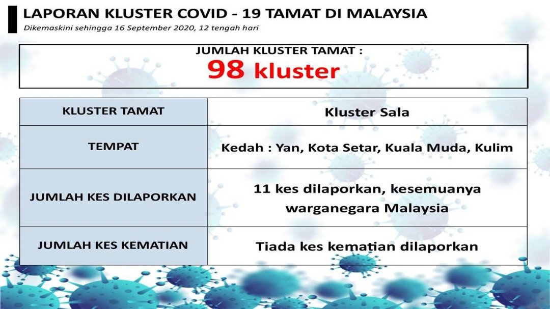 Laporan Kluster COVID-19 Tamat Di Malaysia 16/09/2020 1200 PM Aiman Siaran Media 16 September 2020 Hits: 619 Rating: ( 0 Rating ) Please Rate Vote 1 Vote 2 Vote 3 Vote 4 Vote 5 Lihat / Muat Turun JPG Facebook Twitter Prev Next