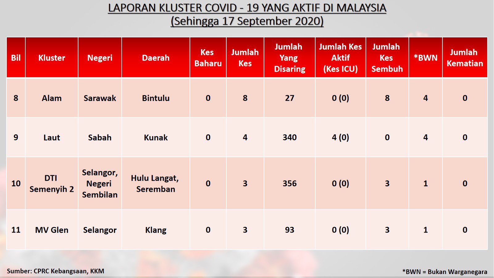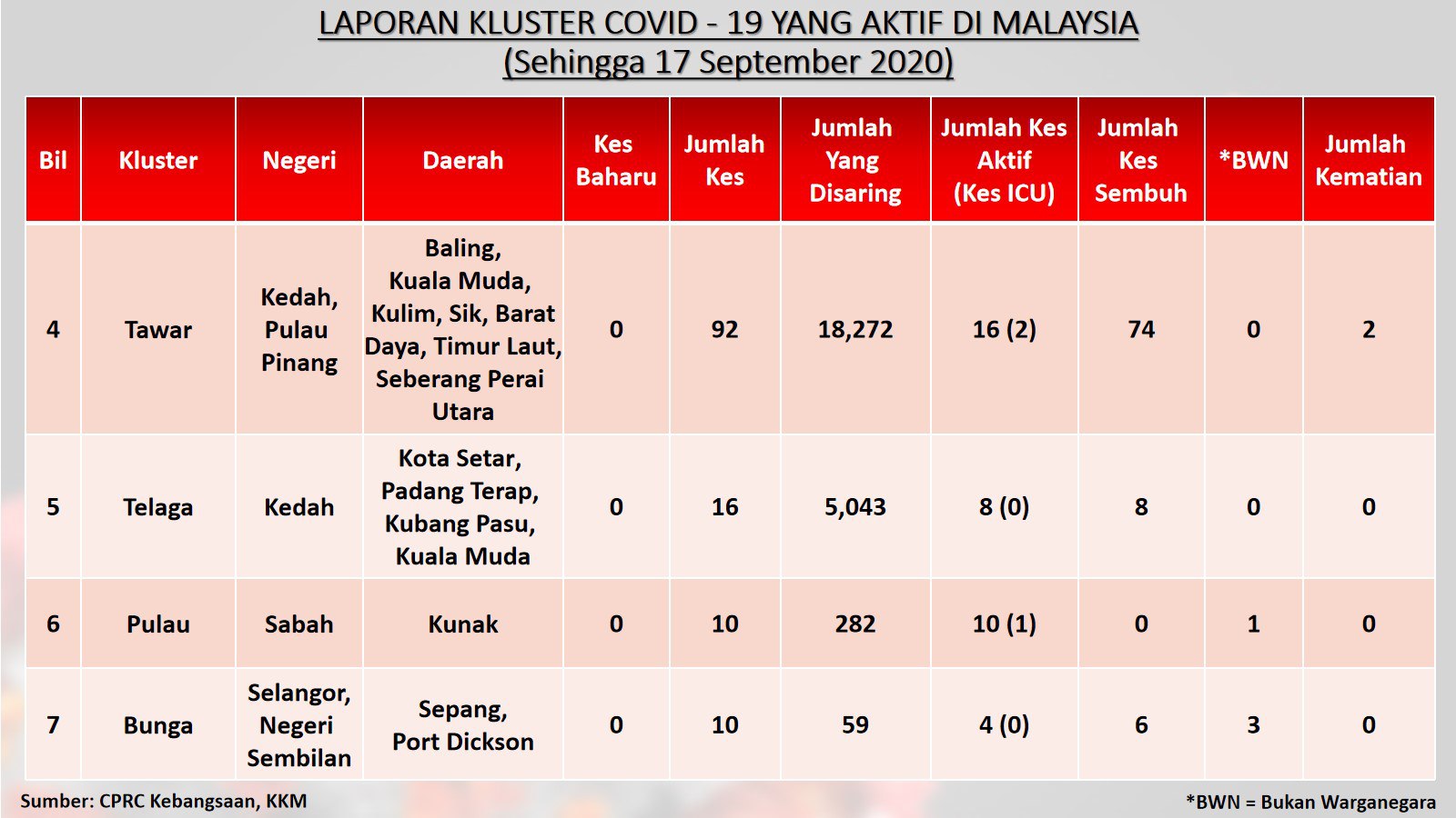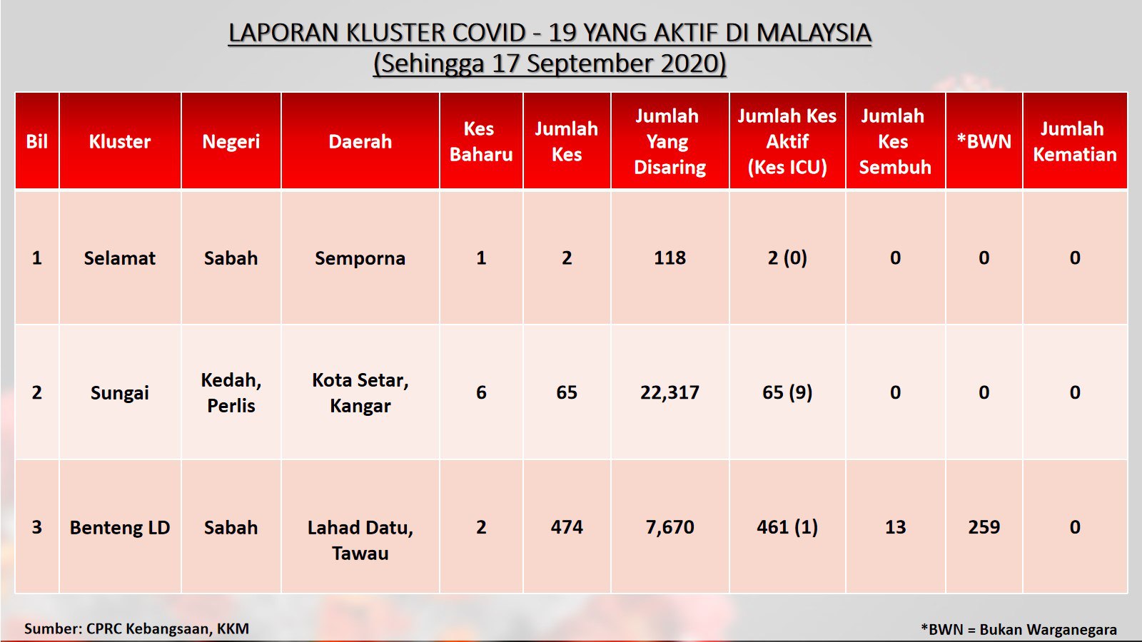 Laporan Kluster COVID-19 Aktif Di Malaysia 17/09/2020 Aiman Siaran Media 17 September 2020 Hits: 896 Rating: ( 0 Rating ) Please Rate Vote 1 Vote 2 Vote 3 Vote 4 Vote 5 Lihat / Muat Turun JPG 1 Lihat / Muat Turun JPG 2 Lihat / Muat Turun JPG 3 Facebook Twitter Prev Next