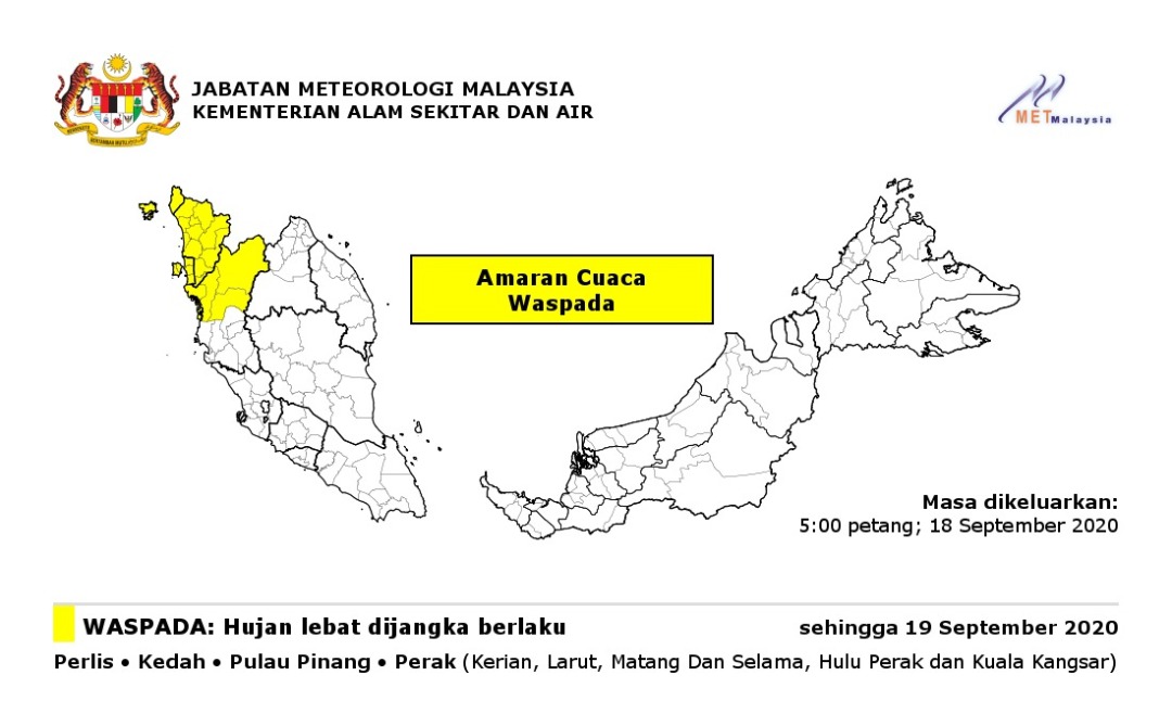 Amaran Cuaca Waspada 18/09/2020 1700 PM Aiman Cuaca 18 September 2020 Hits: 708 Rating: ( 0 Rating ) Please Rate Vote 1 Vote 2 Vote 3 Vote 4 Vote 5 Facebook Twitter Prev Next