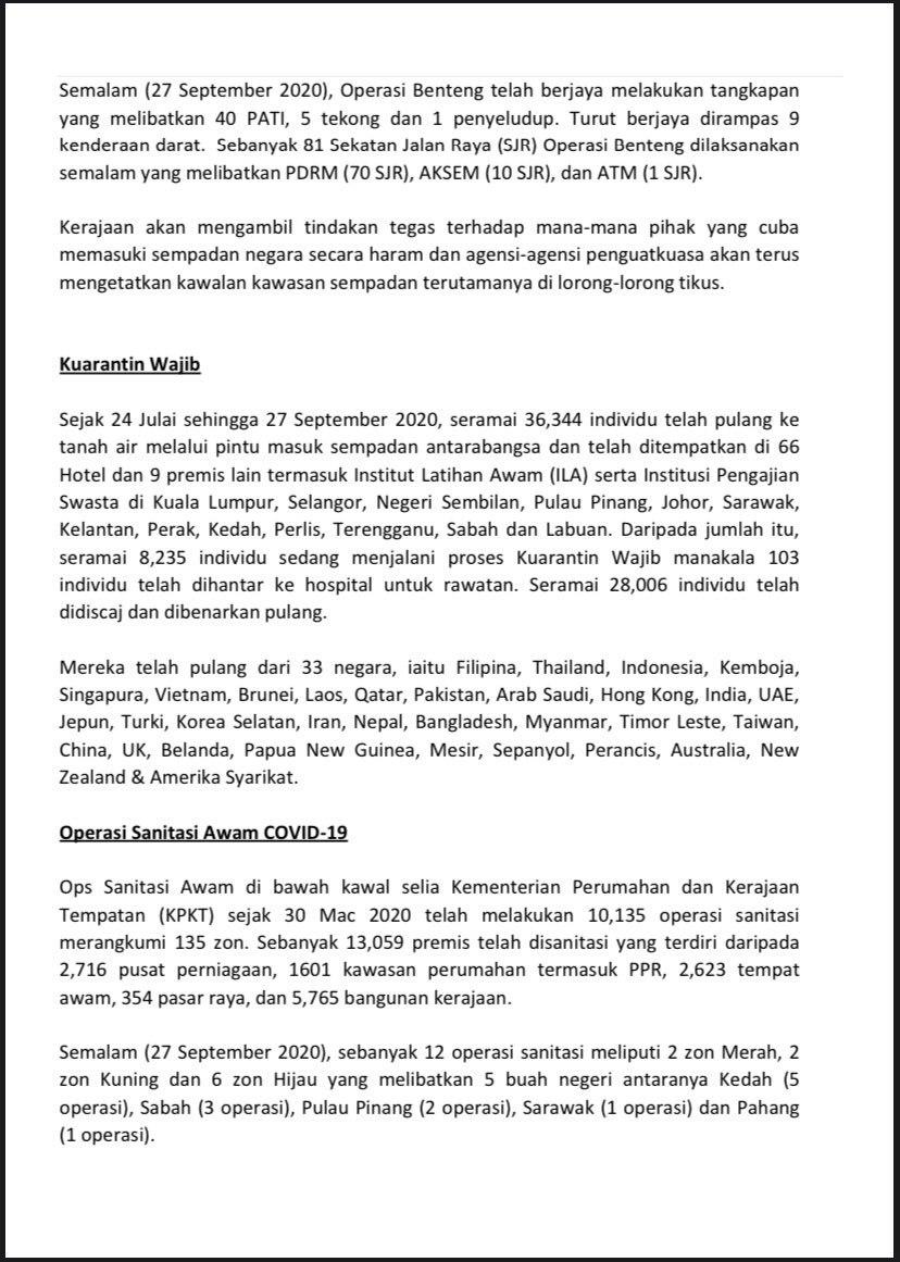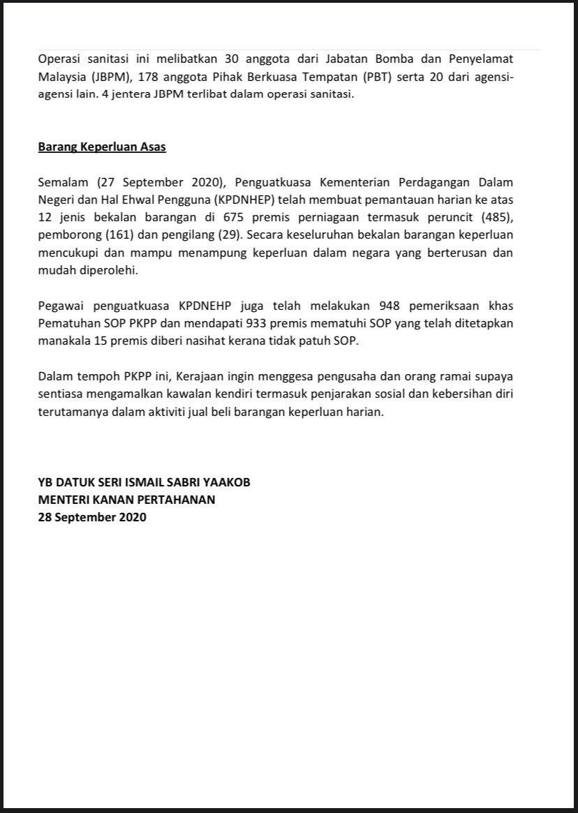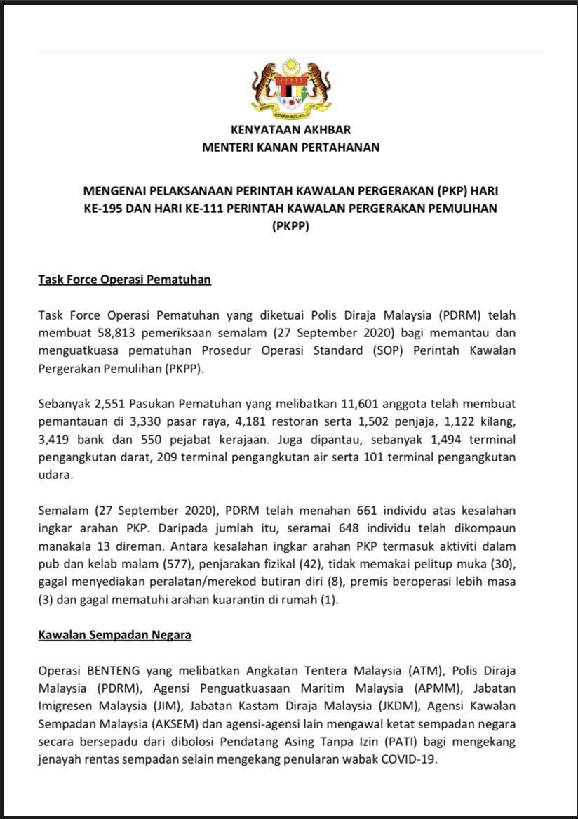 Kenyataan Akhbar Menteri Kanan Pertahanan 28/09/2020 0200 PM Aiman Siaran Media 28 September 2020 Hits: 836 Rating: ( 0 Rating ) Please Rate Vote 1 Vote 2 Vote 3 Vote 4 Vote 5 /bencana2/images/ndcc/documents/covid19/siaranmedia202009/SIARAN_MEDIA_KKM_20200928_03.pdf Facebook Twitter Prev Next