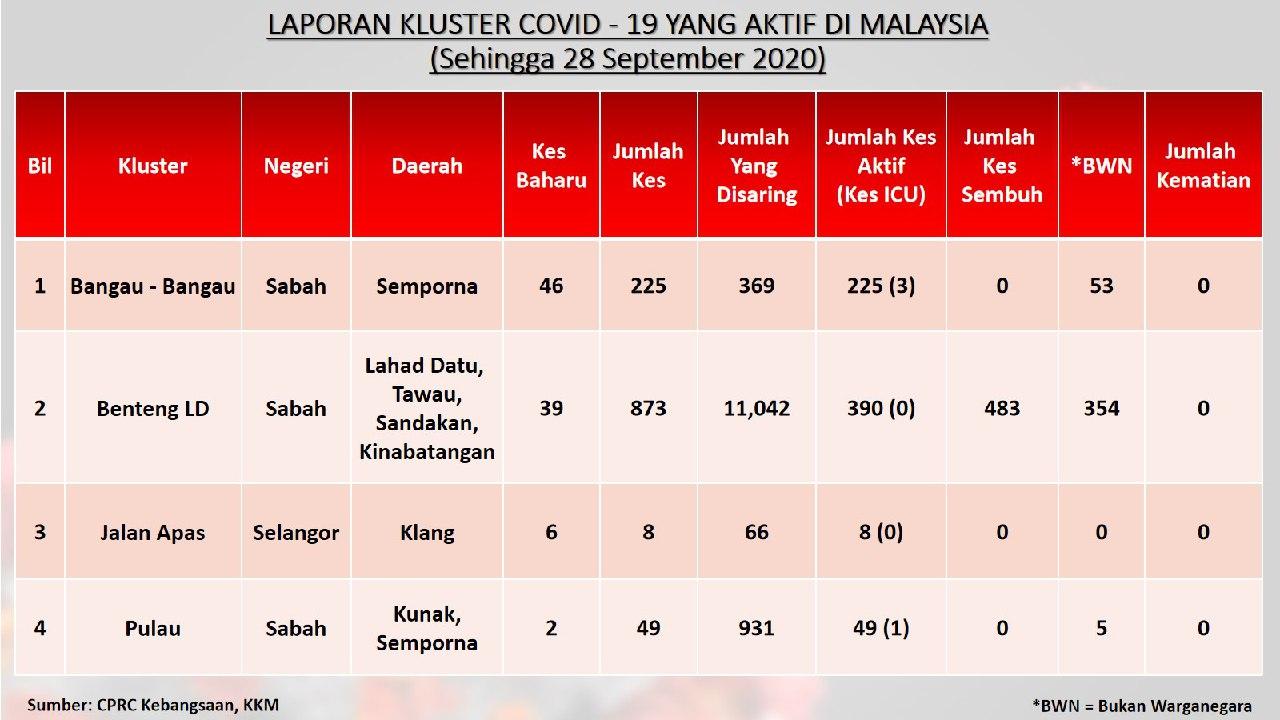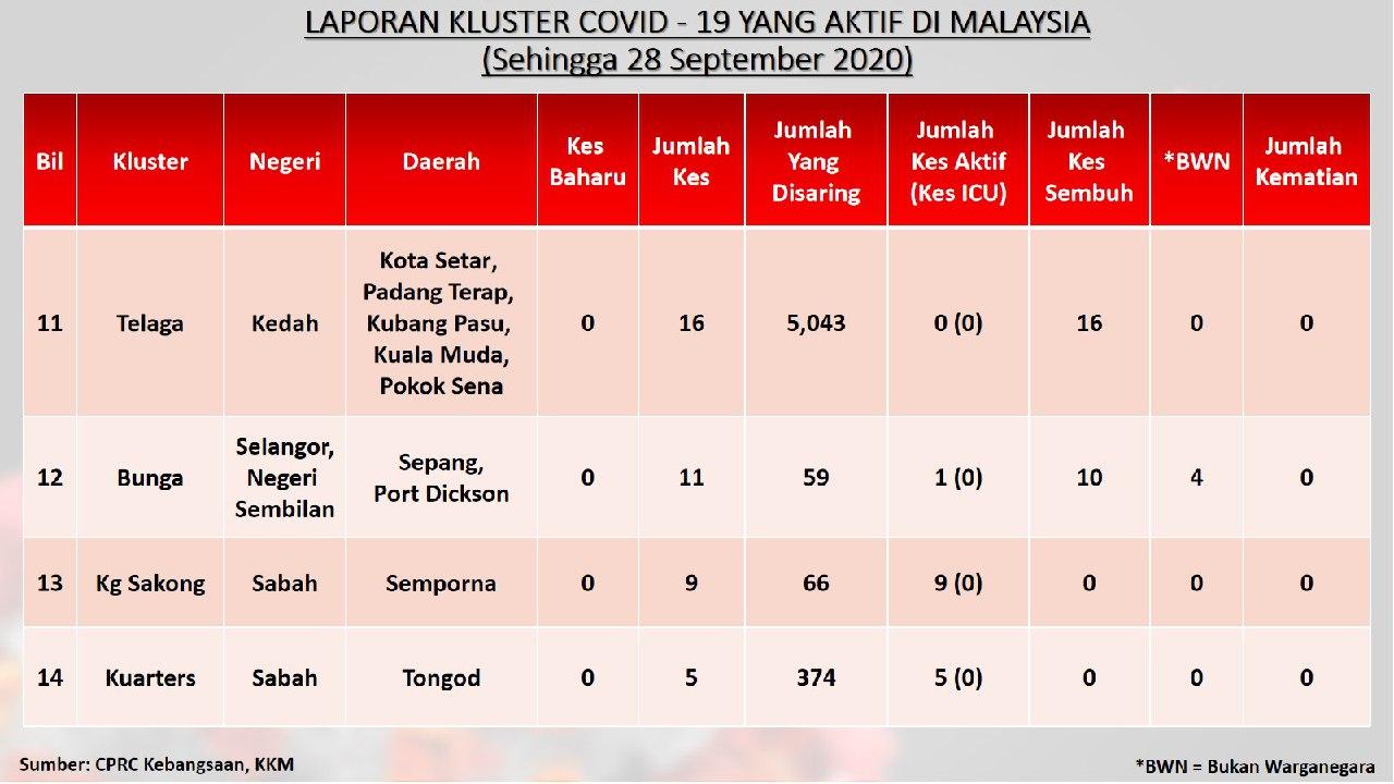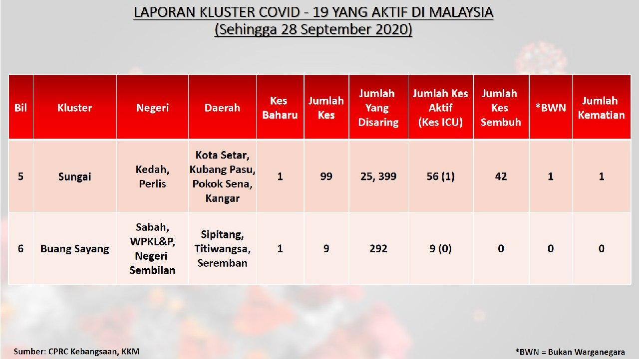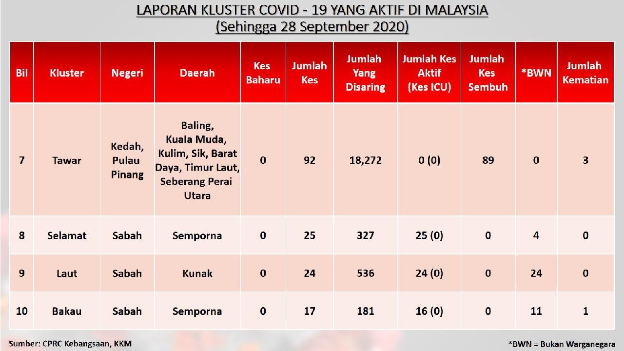 Laporan Kluster COVID-19 Aktif Di Malaysia 28/09/2020 Aiman Siaran Media 28 September 2020 Hits: 659 Rating: ( 0 Rating ) Please Rate Vote 1 Vote 2 Vote 3 Vote 4 Vote 5 Lihat / Muat Turun JPG 1 Lihat / Muat Turun JPG 2 Lihat / Muat Turun JPG 3 Facebook Twitter Prev Next