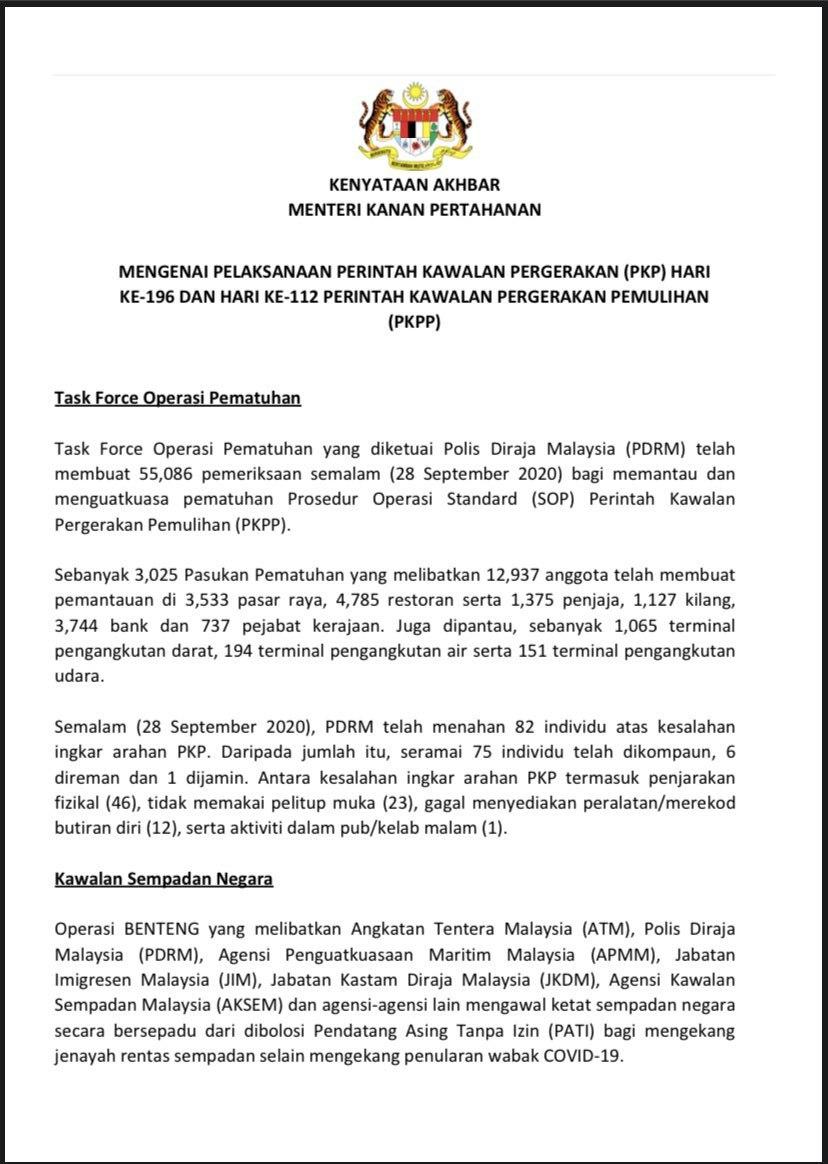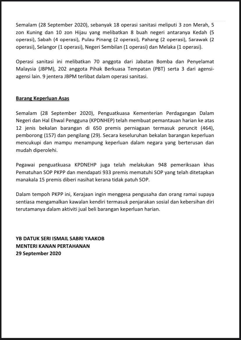 Kenyataan Akhbar Menteri Kanan Pertahanan 29/09/2020 0200 PM Aiman Siaran Media 29 September 2020 Hits: 870 Rating: ( 0 Rating ) Please Rate Vote 1 Vote 2 Vote 3 Vote 4 Vote 5 /bencana2/images/ndcc/documents/covid19/siaranmedia202009/SIARAN_MEDIA_KKM_20200929_06.pdf Facebook Twitter Prev Next