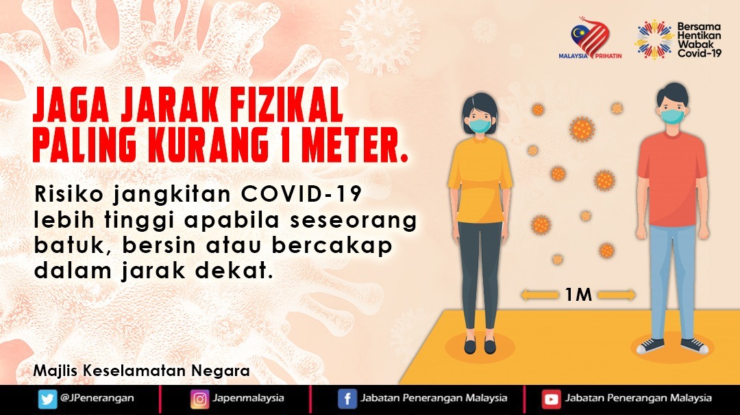 Jaga Jarak Fizikal Paling Kurang 1 Meter Asrul Nasihat 29 September 2020 Hits: 2383 Rating: ( 0 Rating ) Please Rate Vote 1 Vote 2 Vote 3 Vote 4 Vote 5 Facebook Twitter Prev Next