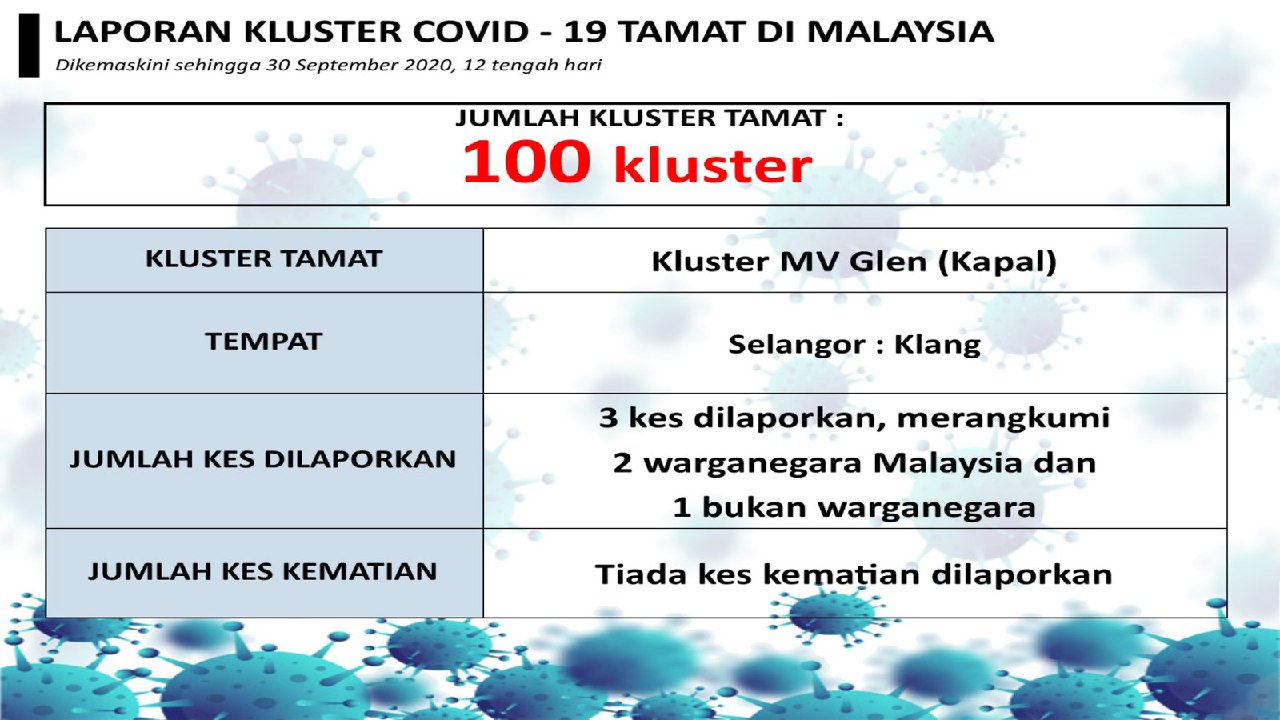 Laporan Kluster COVID-19 Tamat Di Malaysia 30/09/2020 1200 PM Aiman Siaran Media 30 September 2020 Hits: 802 Rating: ( 0 Rating ) Please Rate Vote 1 Vote 2 Vote 3 Vote 4 Vote 5 Lihat / Muat Turun JPG Facebook Twitter Prev Next