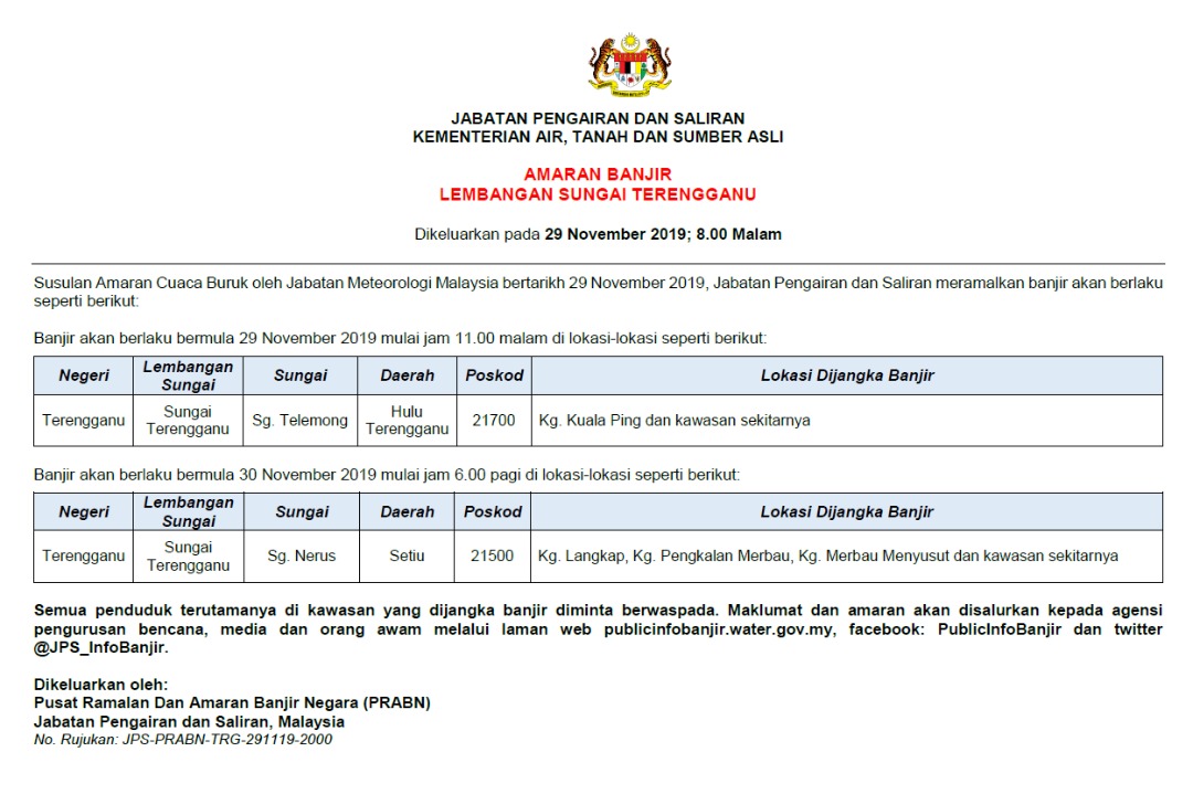 Amaran Banjir 29/11/2019 0800 PM Asrul Cuaca 29 November 2019 Hits: 1410 Rating: ( 0 Rating ) Please Rate Vote 1 Vote 2 Vote 3 Vote 4 Vote 5 Lihat / Muat Turun PDF Facebook Twitter Prev Next