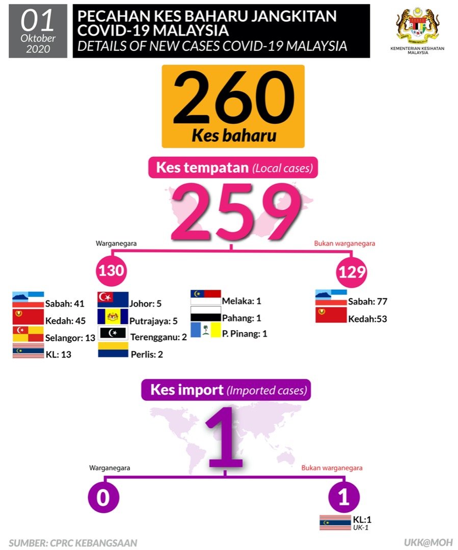 Statistik Pecahan Kes Baharu Jangkitan COVID-19 Malaysia 01/10/2020 Aiman Siaran Media 01 October 2020 Hits: 625 Rating: ( 0 Rating ) Please Rate Vote 1 Vote 2 Vote 3 Vote 4 Vote 5 Lihat / Muat Turun JPG Facebook Twitter Prev Next