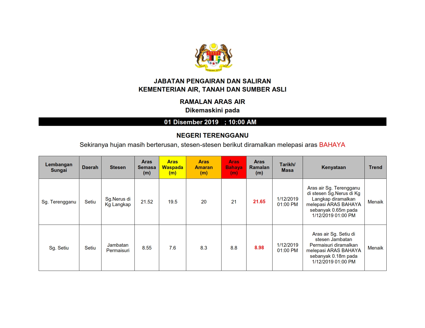 Ramalan Aras Air 01/12/2019 1000 AM Aiman Cuaca 01 December 2019 Hits: 1097 Rating: ( 0 Rating ) Please Rate Vote 1 Vote 2 Vote 3 Vote 4 Vote 5 Lihat / Muat Turun PDF Muat Turun JPG 1 Muat Turun JPG 2 Facebook Twitter Prev Next