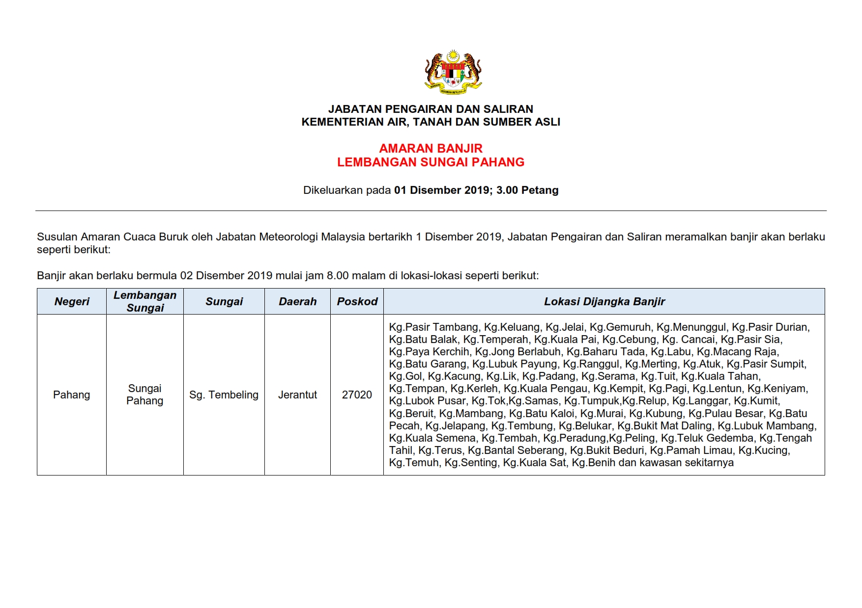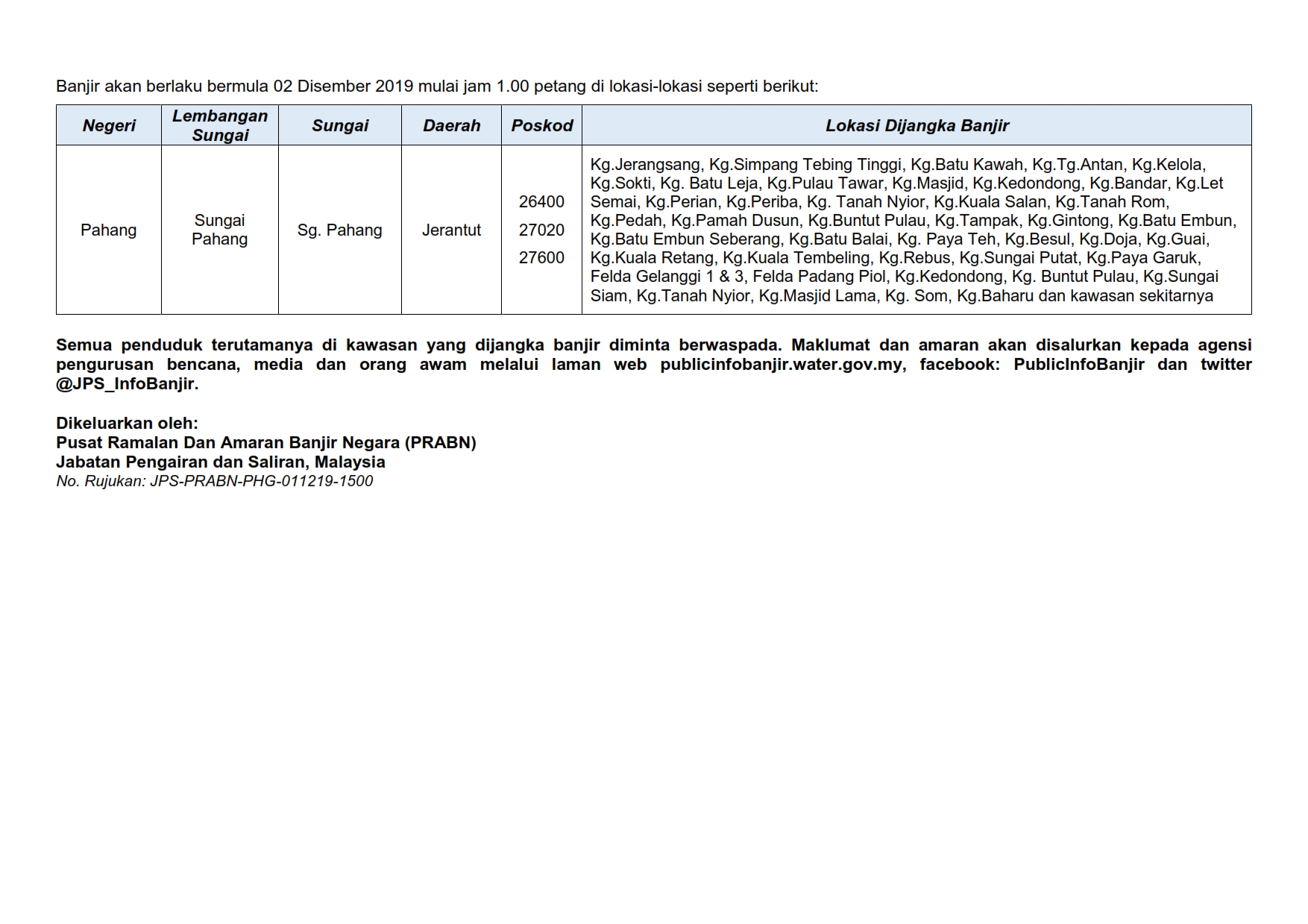 Amaran Banjir 01/12/2019 0300 PM Asrul Cuaca 01 December 2019 Hits: 1097 Rating: ( 0 Rating ) Please Rate Vote 1 Vote 2 Vote 3 Vote 4 Vote 5 Muat Turun PDF Muat Turun JPG 1 Muat Turun JPG 2 Facebook Twitter Prev Next