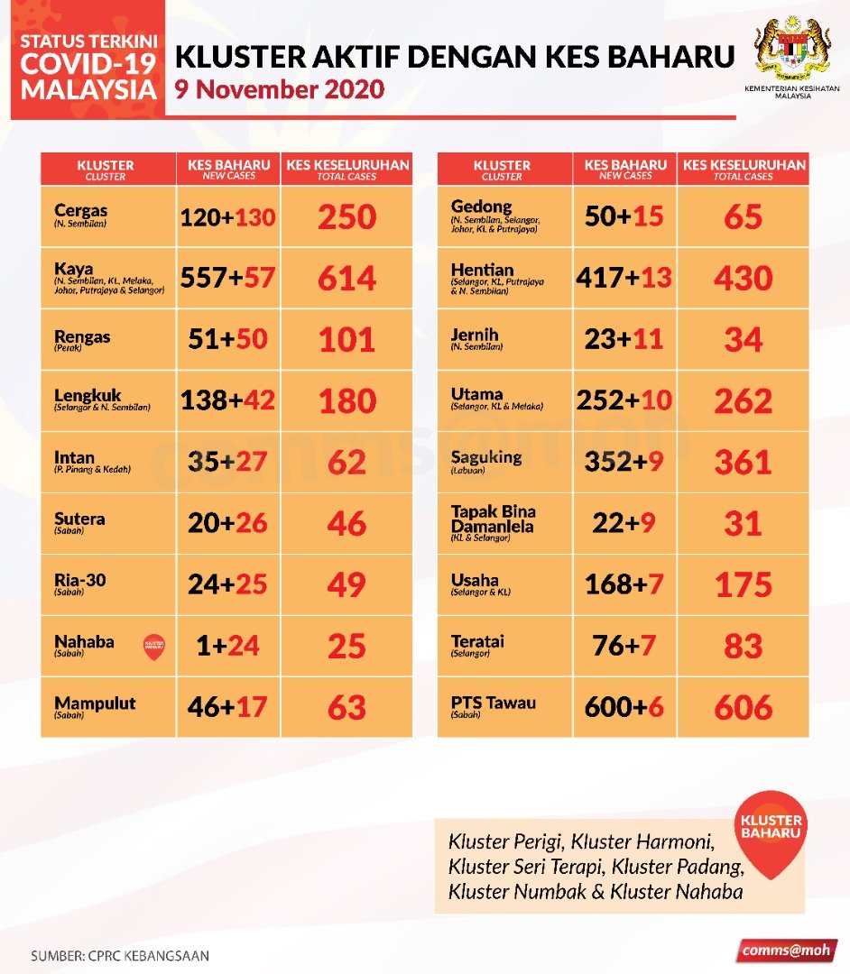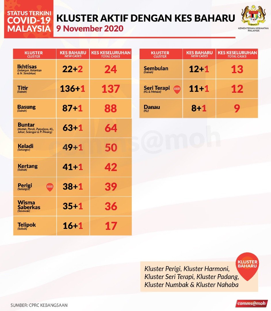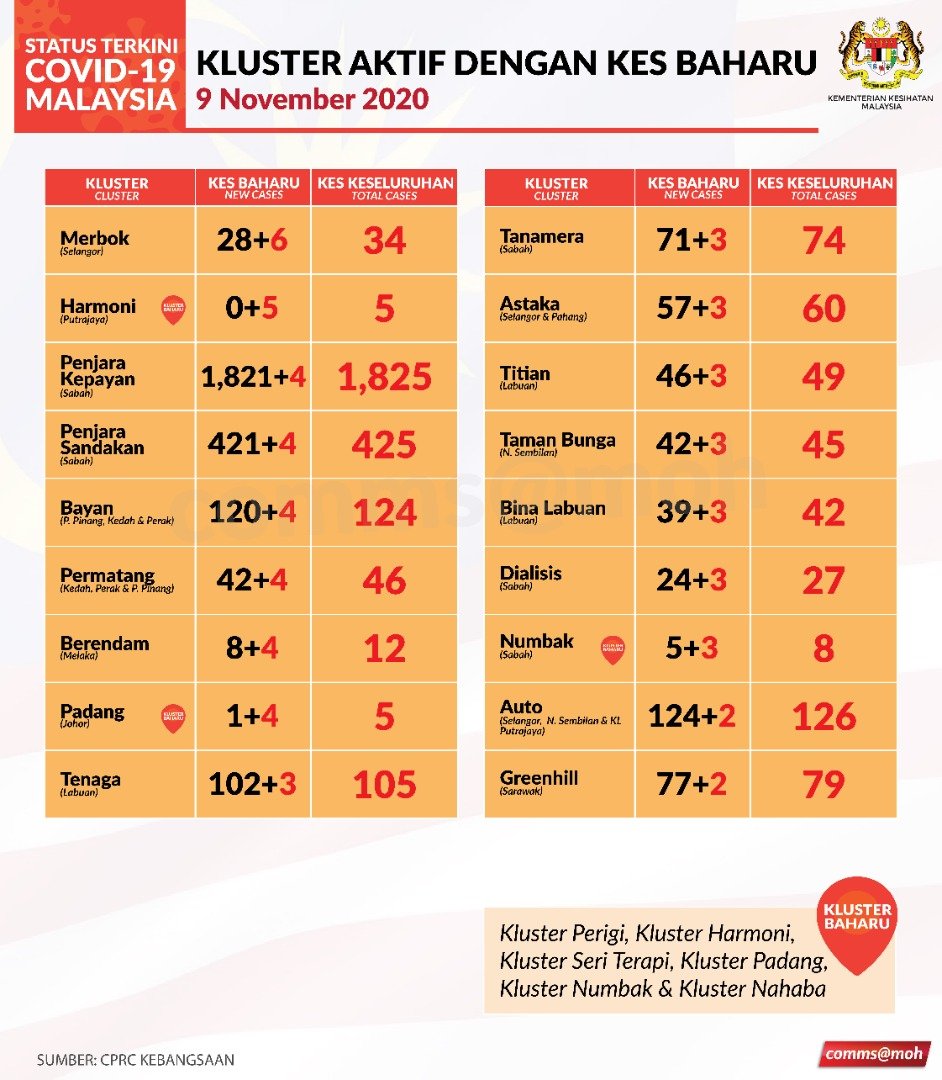 Situasi Terkini Kluster Aktif Dengan Kes Baharu Covid-19 09/11/2020 Aiman Siaran Media 09 November 2020 Hits: 889 Rating: ( 0 Rating ) Please Rate Vote 1 Vote 2 Vote 3 Vote 4 Vote 5 Lihat / Muat Turun JPG 1 Lihat / Muat Turun JPG 2 Lihat / Muat Turun JPG 3 Facebook Twitter Prev Next