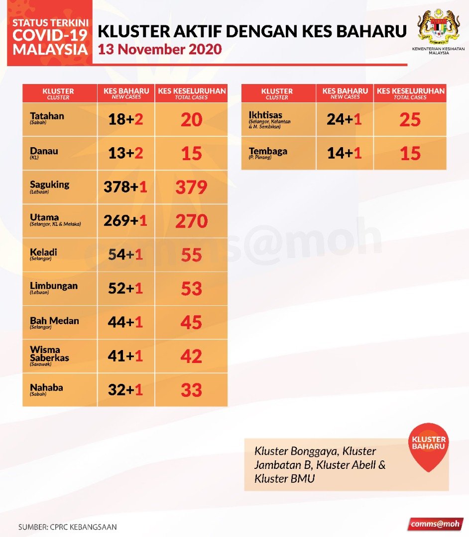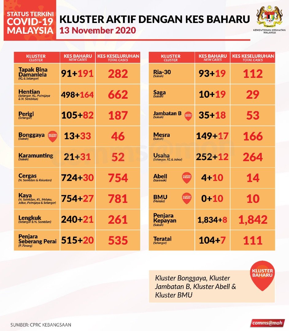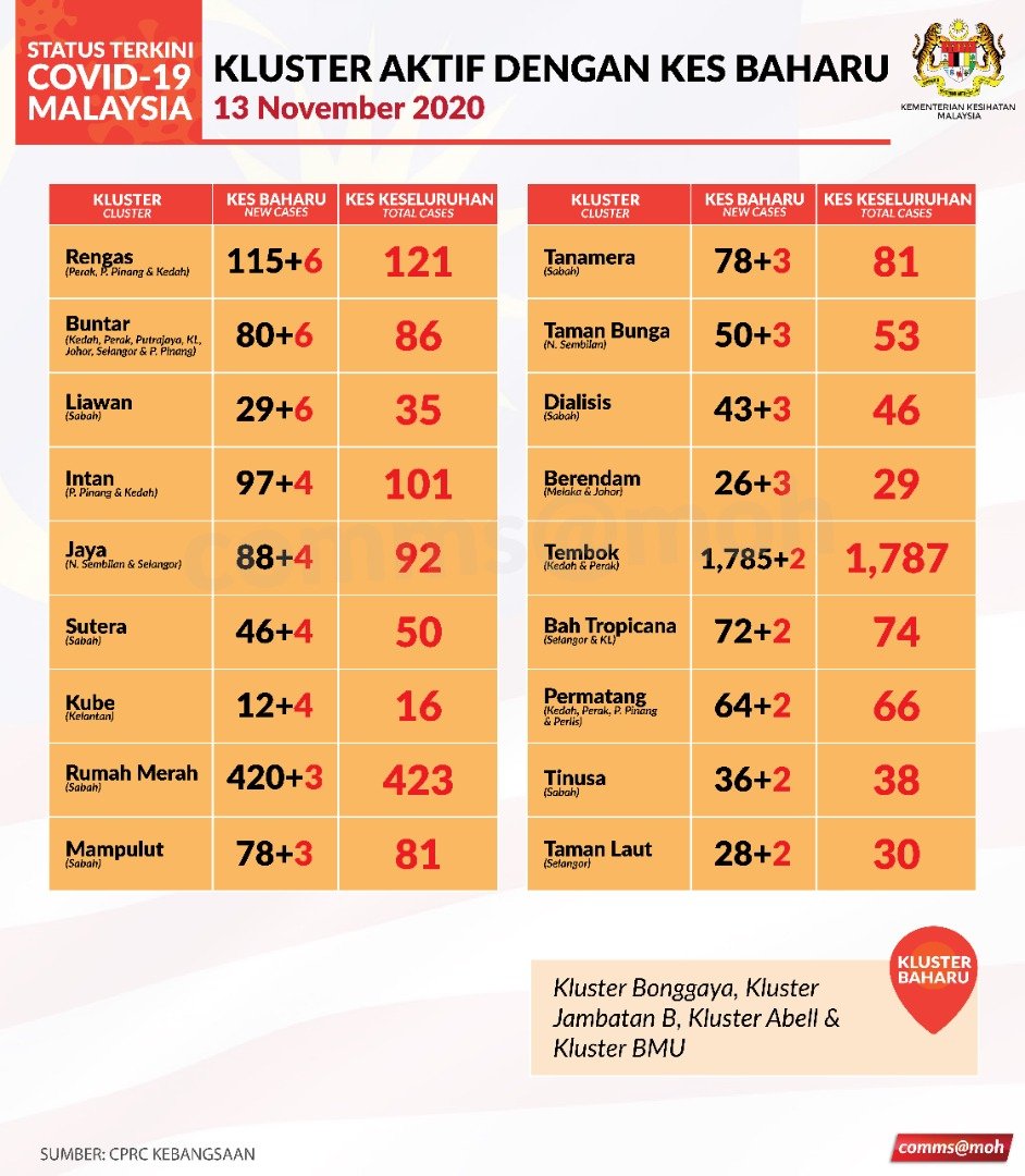 Situasi Terkini Kluster Aktif Dengan Kes Baharu Covid-19 13/11/2020 Aiman Siaran Media 13 November 2020 Hits: 728 Rating: ( 0 Rating ) Please Rate Vote 1 Vote 2 Vote 3 Vote 4 Vote 5 Lihat / Muat Turun JPG 1 Lihat / Muat Turun JPG 2 Lihat / Muat Turun JPG 3 Facebook Twitter Prev Next