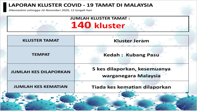 Laporan Kluster COVID-19 Tamat Di Malaysia 16/11/2020 1200 PM Aiman Siaran Media 16 November 2020 Hits: 745 Rating: ( 0 Rating ) Please Rate Vote 1 Vote 2 Vote 3 Vote 4 Vote 5 Facebook Twitter Prev Next