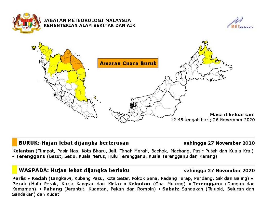 Amaran Cuaca Buruk 26/11/2020 1245 PM Norbazliah Cuaca 26 November 2020 Hits: 1148 Rating: ( 0 Rating ) Please Rate Vote 1 Vote 2 Vote 3 Vote 4 Vote 5 Lihat / Muat Turun JPG Facebook Twitter Prev Next